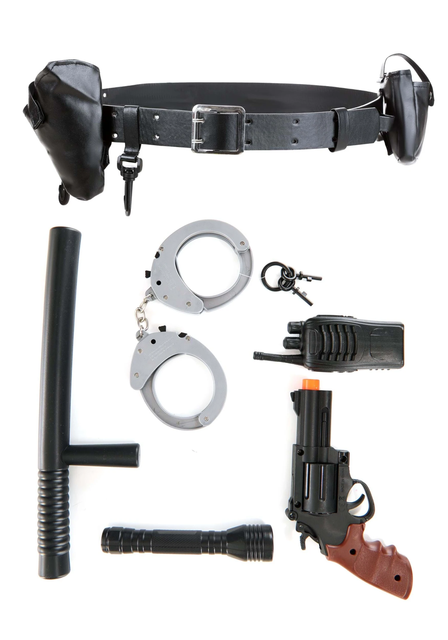 Lay down the law with the help of this exclusive Adult Cop Costume Belt Accessory Set! The faux leather belt has a silver-tone buckle, a holster, a pouch, and several attached loops which you’ll need for hanging the included accessories. The belt comes with a toy gun, a set of toy handcuffs with keys, a faux walkie-talkie, and more. Bad guys, beware!Â