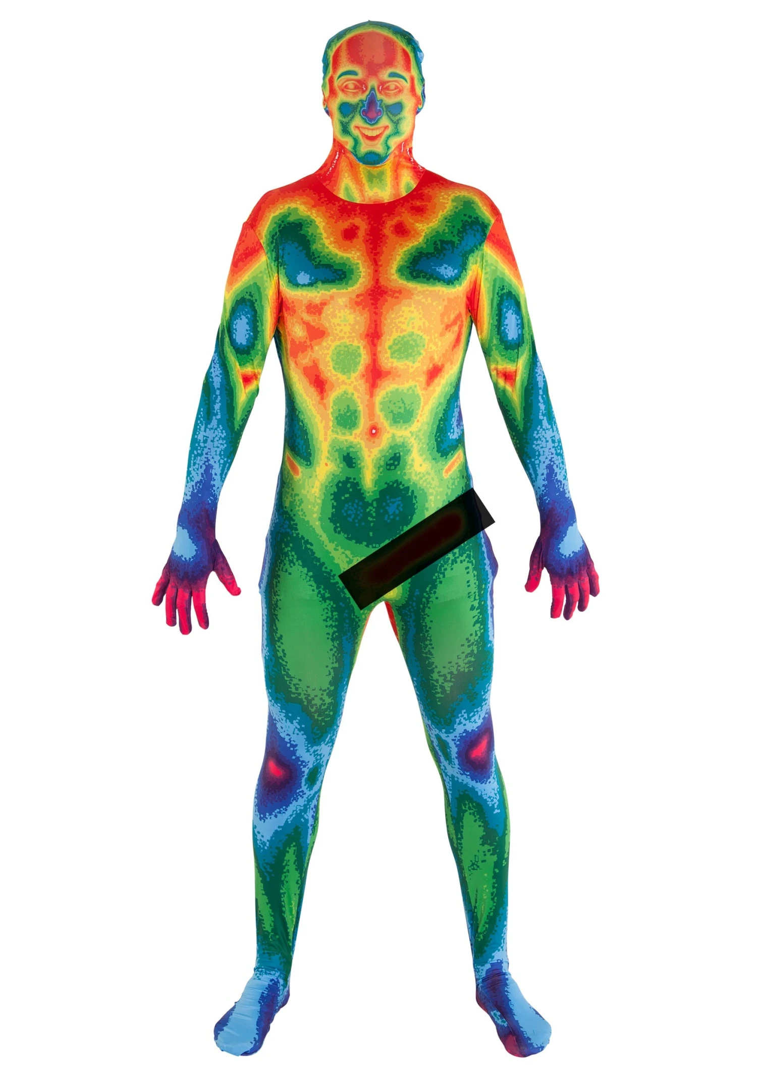 Take off to your Halloween party in bright style with our alien friend’s Infrared Rocket costume. This is a skin-tight bodysuit that is printed to look like the heat signature of your every-day, red-blooded human. Something tells us that our alien buddy is a male, but we’re not 100% sure why. We suspect that you’ll figure that out, though. The suit zips up the back and includes hook and loop closures on the back. You’re certain to have a pretty fun (or at least funny) outing in this look.Â