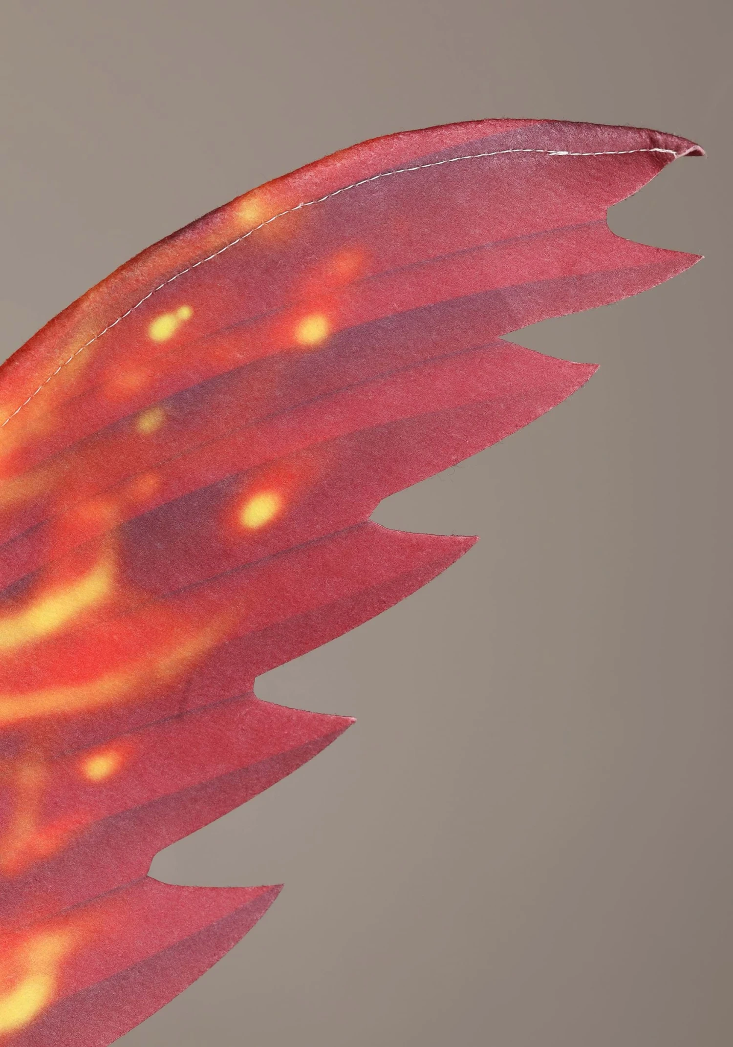 This Made By Us costume starts with a color-blocked robe. The left is bright white, while the right features printed flames. The robe is designed as a pullover for easy wear. An elastic waistband holds it snug while the matching flame-print belt secures around the waist with hook-and-loop fasteners to add polish. The two-toned wings wear over-the-shoulder with elastic bands. Completing the look is a devil horn and angel halo headband!