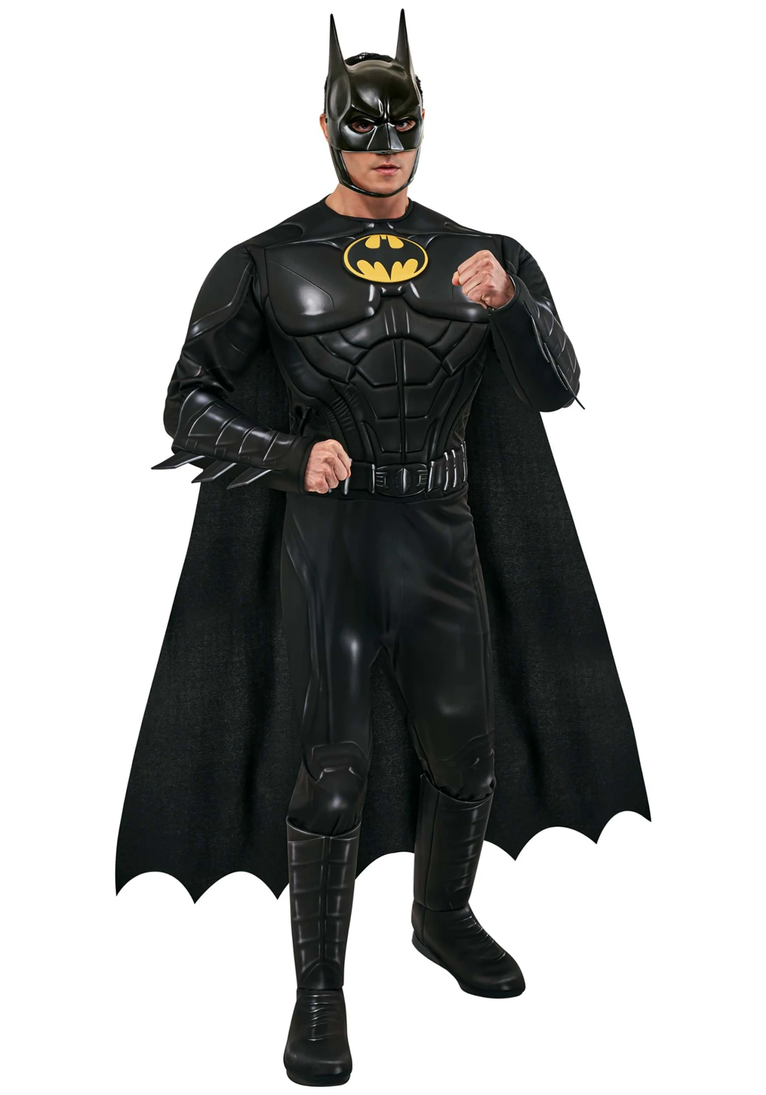 Practice your best bat scowl for when you wear this officially licensed Batman Deluxe Costume for Men! The one-piece jumpsuit fastens at the back. Its chest is sculpted to look like a muscled breastplate and its sleeves feature attached gauntlets with soft black spikes. The suit’s legs tuck neatly inside the attached boot covers. A cape with a reverse-scalloped hem attaches to the back of the shoulders with hook & loop fastener. The outfit comes with a molded Batman mask complete with pointed bat ears.Â