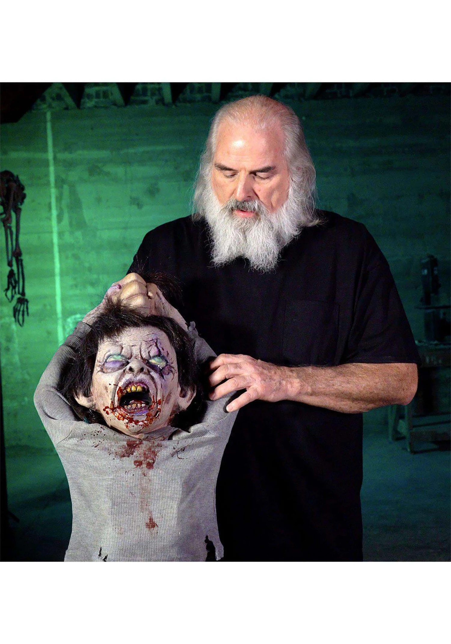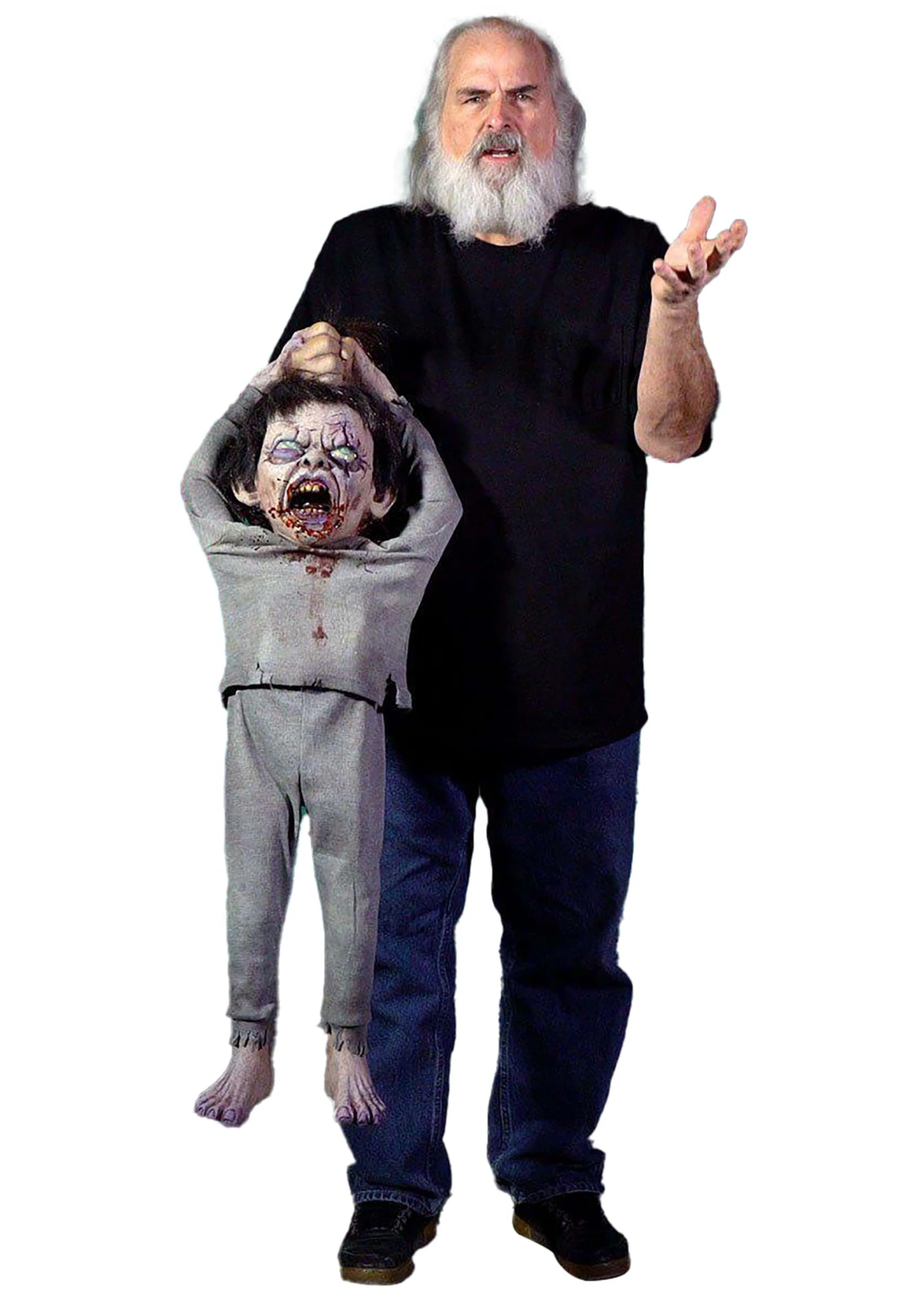 Enjoy the horrified stares you receive when you use this Billie Bite Evil Puppet Halloween Prop! The puppet has a menacing expression and a bloodstained mouth – his grey uniform makes it clear that he has broken free from a facility to terrorize the town! A fake hand makes it appear that you are holding him by his hair, while a hole in the back of his head lets you use your hand to make the puppet move as though he is struggling to free himself to give you a nasty chomp!Â