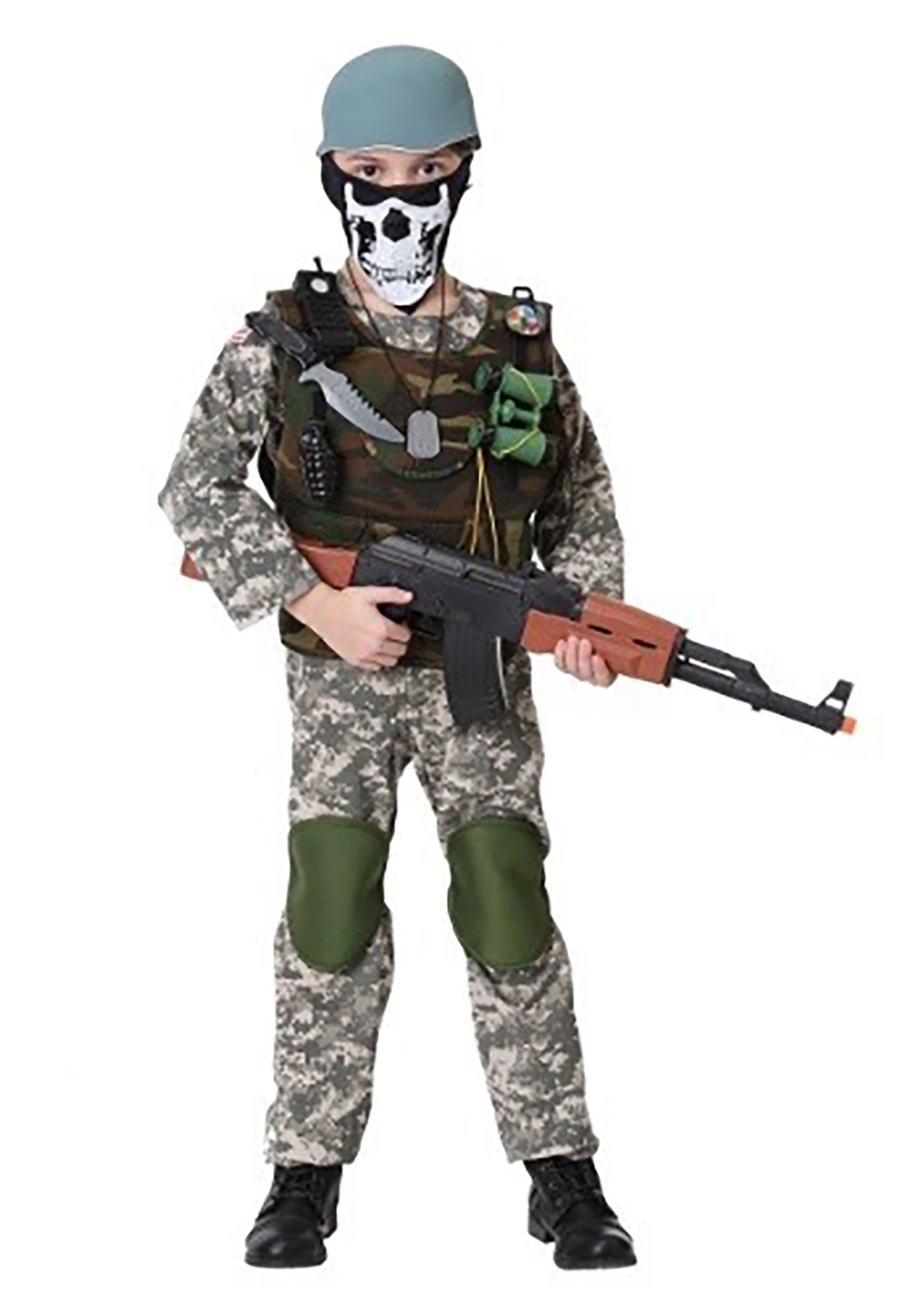 Your little soldier will always be prepared with this Camo Trooper Costume! It comes with everything they will need to stay on top of any situation, including a digital camo jumpsuit and woodland camo vest to quickly blend into different environments. The green foam helmet will help them blend in and green foam knee pads help them stay comfortable while doing all that crouching and kneeling during recon missions. When he puts on the scary black skull-printed bandana, it will show the bad guys he means business! It also comes with plenty of cool equipment (it’s just plastic though because the real equipment is heavy!) like toy binoculars and a walkie-talkie and other gear so your trooper will have any situation on lockdown when the bad guys show up!