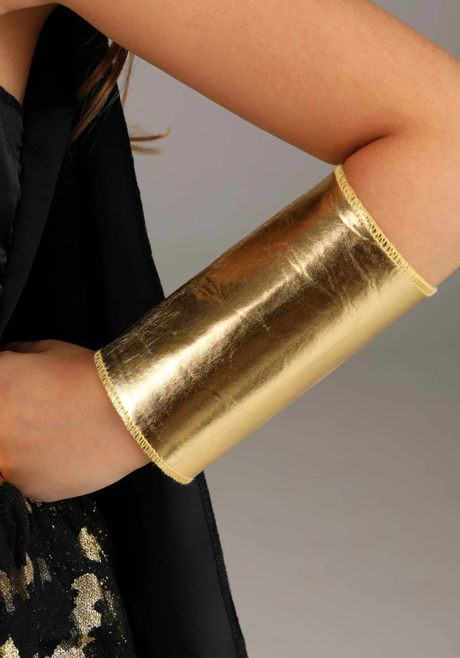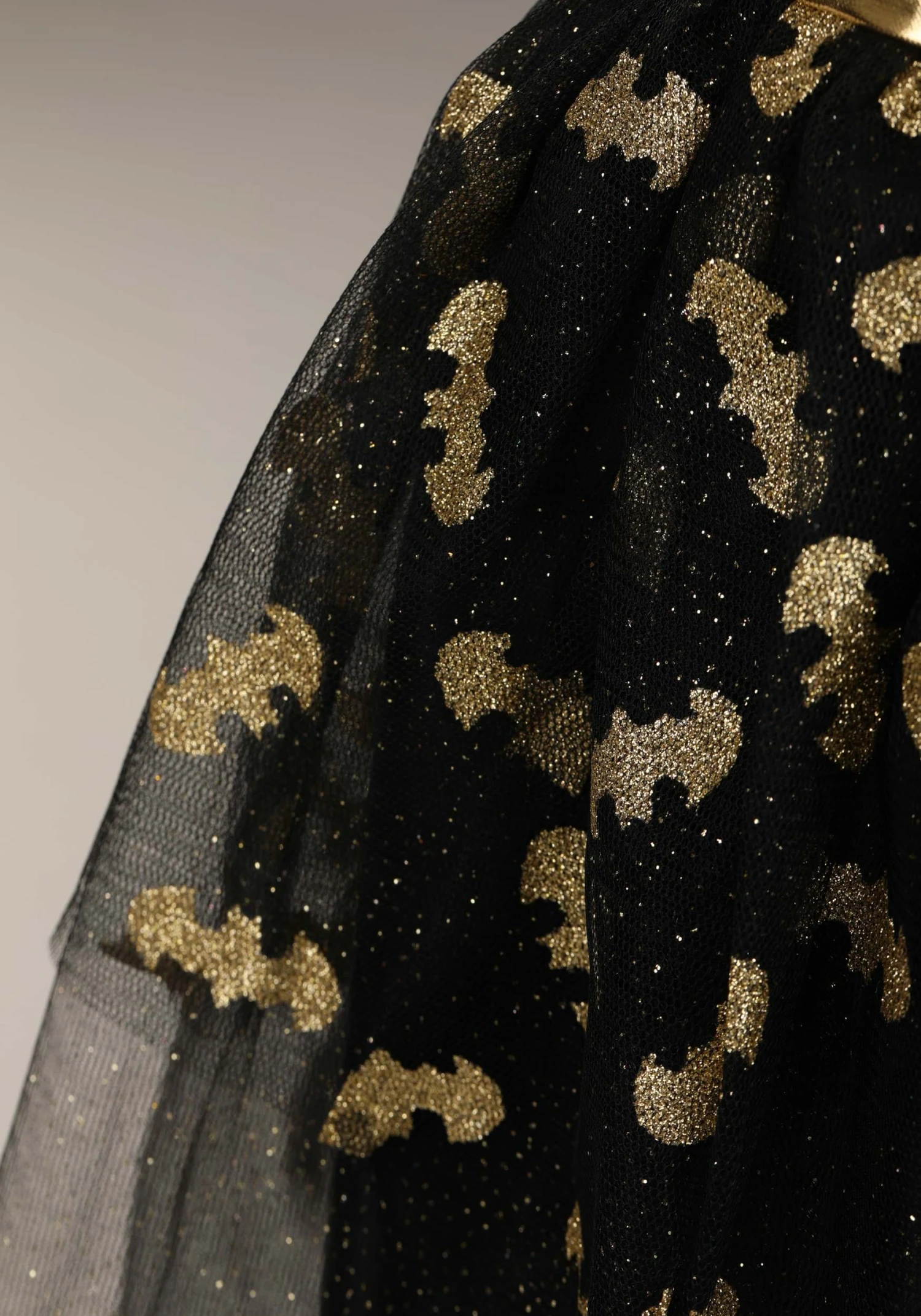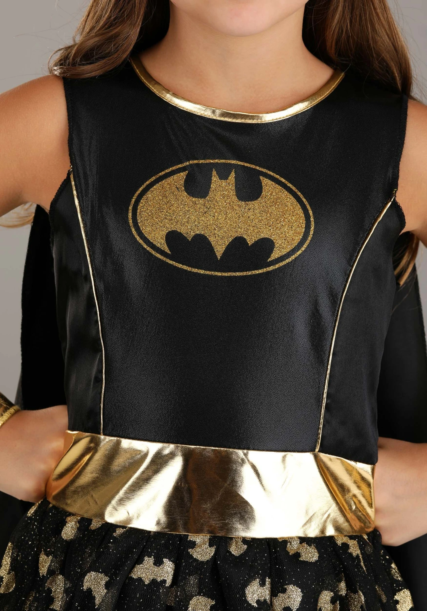 Any child who’s looking for a superhero dress outfit is simply going to adore this Brilliant Batgirl Costume. The costume set features a fun and funky Batgirl dress and also includes a cape, mask, and a pair of gauntlets. The dress goes on as a pullover and features a gold sash attached at the waistline to look like a belt. The dress top features a glittery gold Batgirl bat logo, and the skirt features sparkly layered tulle with more Bat logos and more glitter accents. The black cape attaches at the shoulder with hook and loop fasteners and a glitter felt mask fits with an elastic band. Finally, gold gauntlets slip over the wrists to match the waist fabric and put the finishing touch on this chic superhero style!