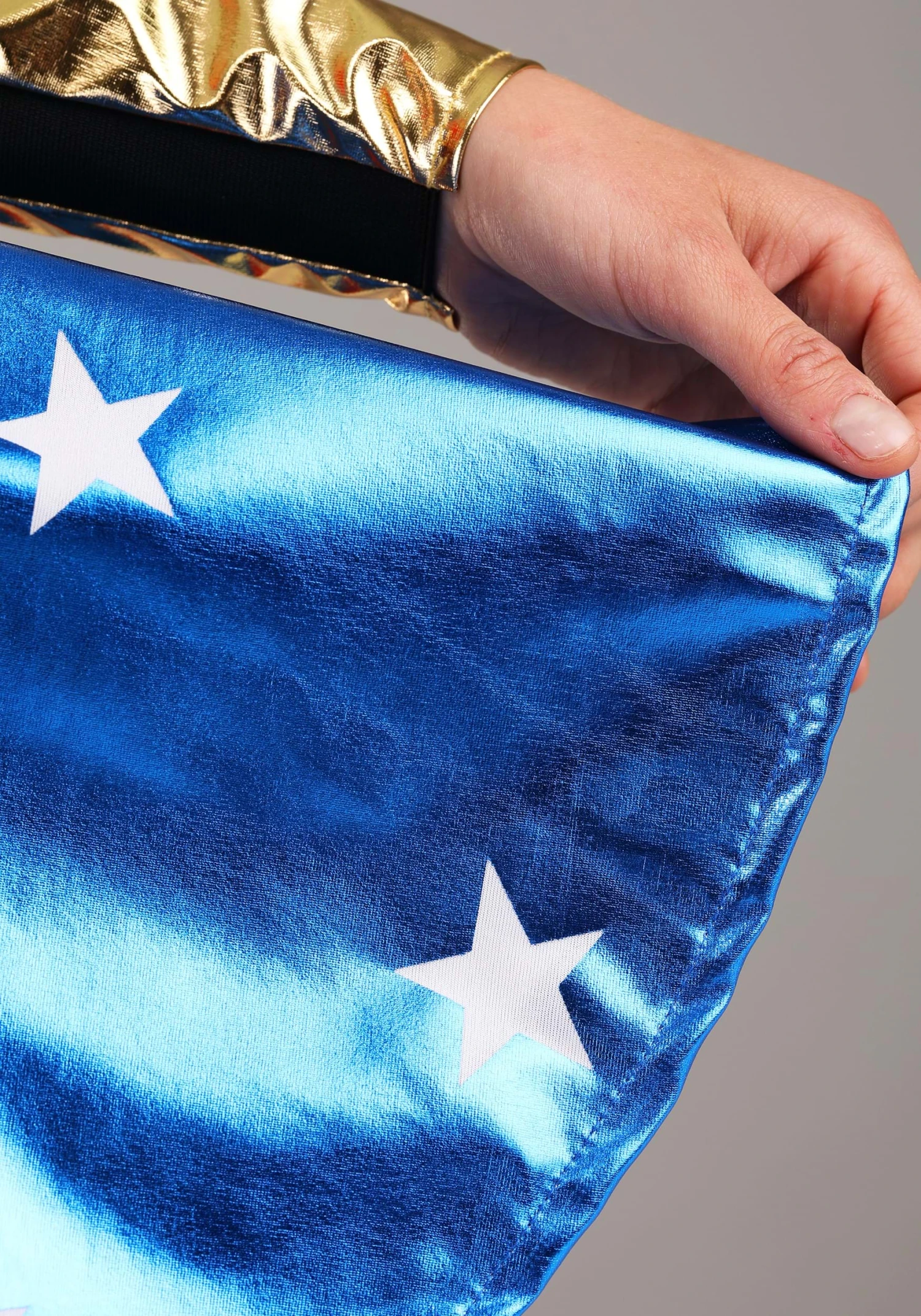 Claim your go-getter Amazonian princess destiny with this Caped Wonder Woman Costume for Adults! The nostalgically-designed minidress ends at midthigh and has a beautifully shiny blue skirt freckled with white stars and a red, sleeveless top with the Wonder Woman logo printed on the chest. A golden belt circles your waist and matching golden gauntlets protect your wrists. A flowy red cape attaches to your shoulders via Velcro patches and a golden headband with a red center star is the literal crowning touch.Â