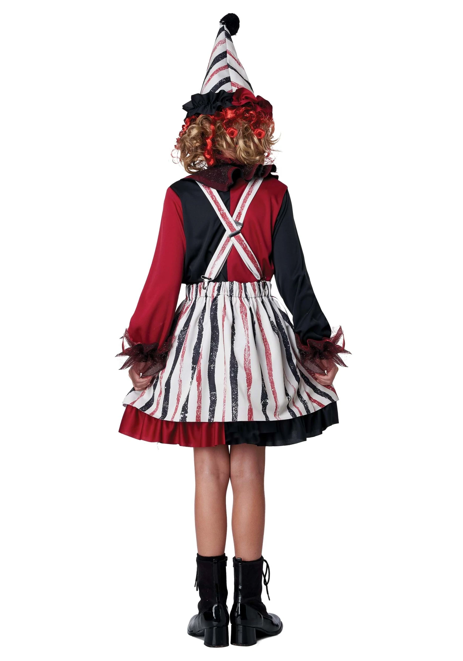 That is where this Girl’s Clever Clown Child Costume excels! It has all the hallmarks of a smart and slightly wicked jester, while still being stylish and chic. The overall style dress and poofy-cuffed shirt place it well into the quirky jester category, while the dark colors declare it to be quite spooky. The matching hat and frilly neck add that extra little bit of comically scary feeling that will set you apart from the other wannabe clowns!