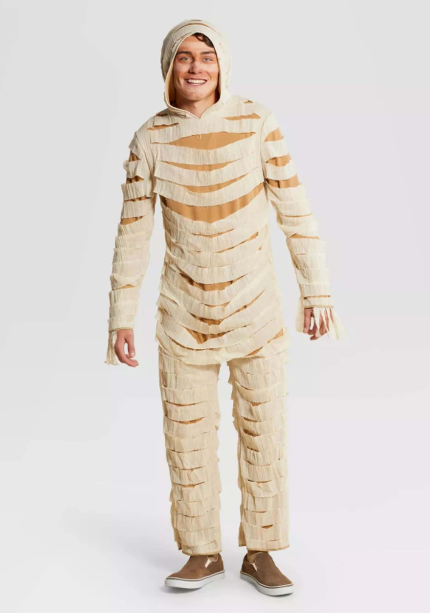 Pharaoh lives again in this Crypt Mummy Costume for Adults! The tan-colored jumpsuit features raggedy bandages wrapped around the torso and arms. Shredded wrapping material dangles from the sleeves. The attached hood also has bandage detail and hides the places where the embalmer sucked out your brains (yep, brains were thought to be useless organs back in Ancient Egypt).Â