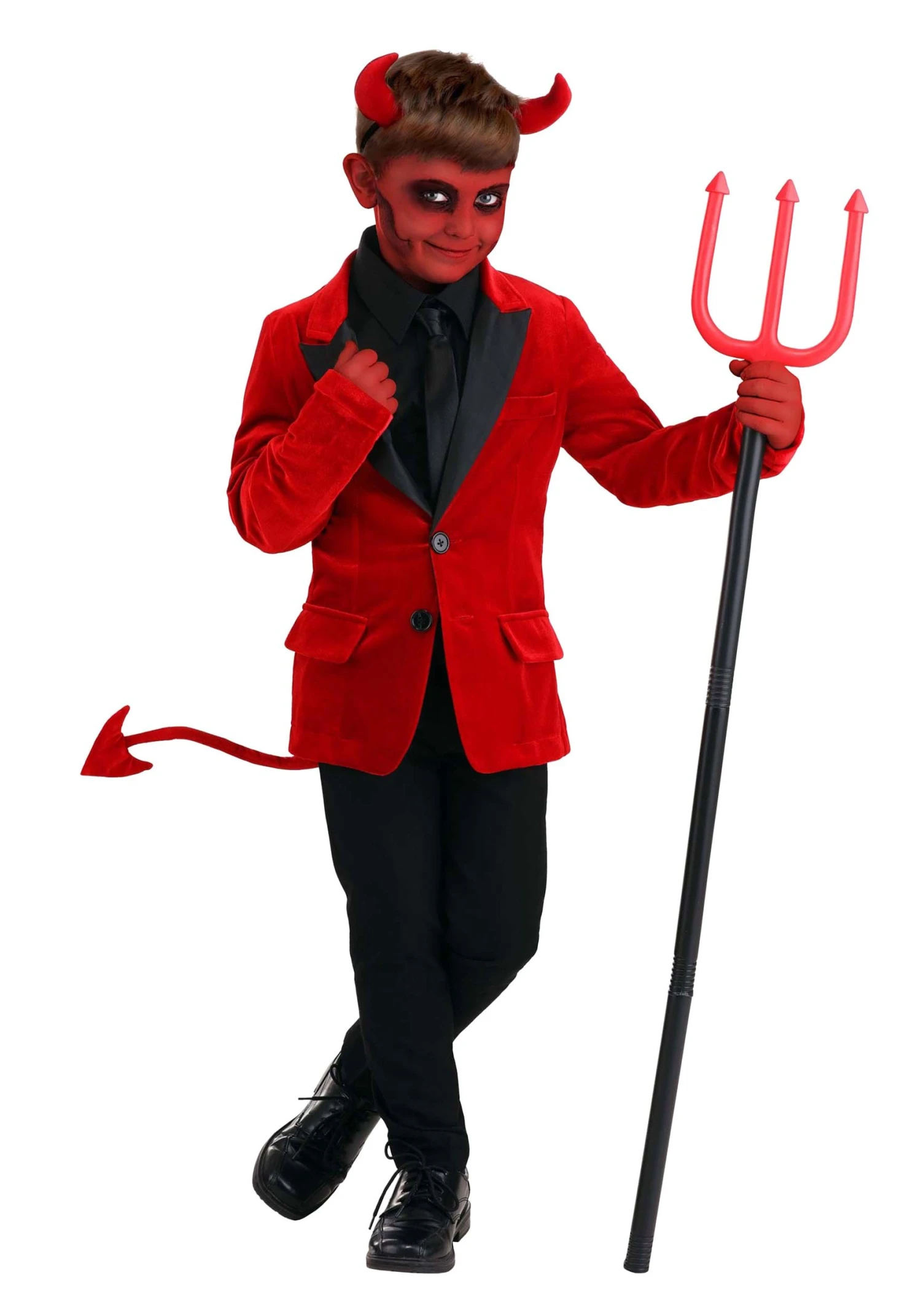 Be scarily stylish when you wear your exclusive Dashing Devil Costume for Boys! The soft red velour jacekt values at the front with values that are black to match the lapels. The front is decorated with two faux chest pockets and pocket flaps. The long velour tail sewn to the back of the jacket has a triangular point and conceals an inner wire that allows you to pose the tail as desired. Secure the fiber-filled horns around your head with the attached elastic band.Â