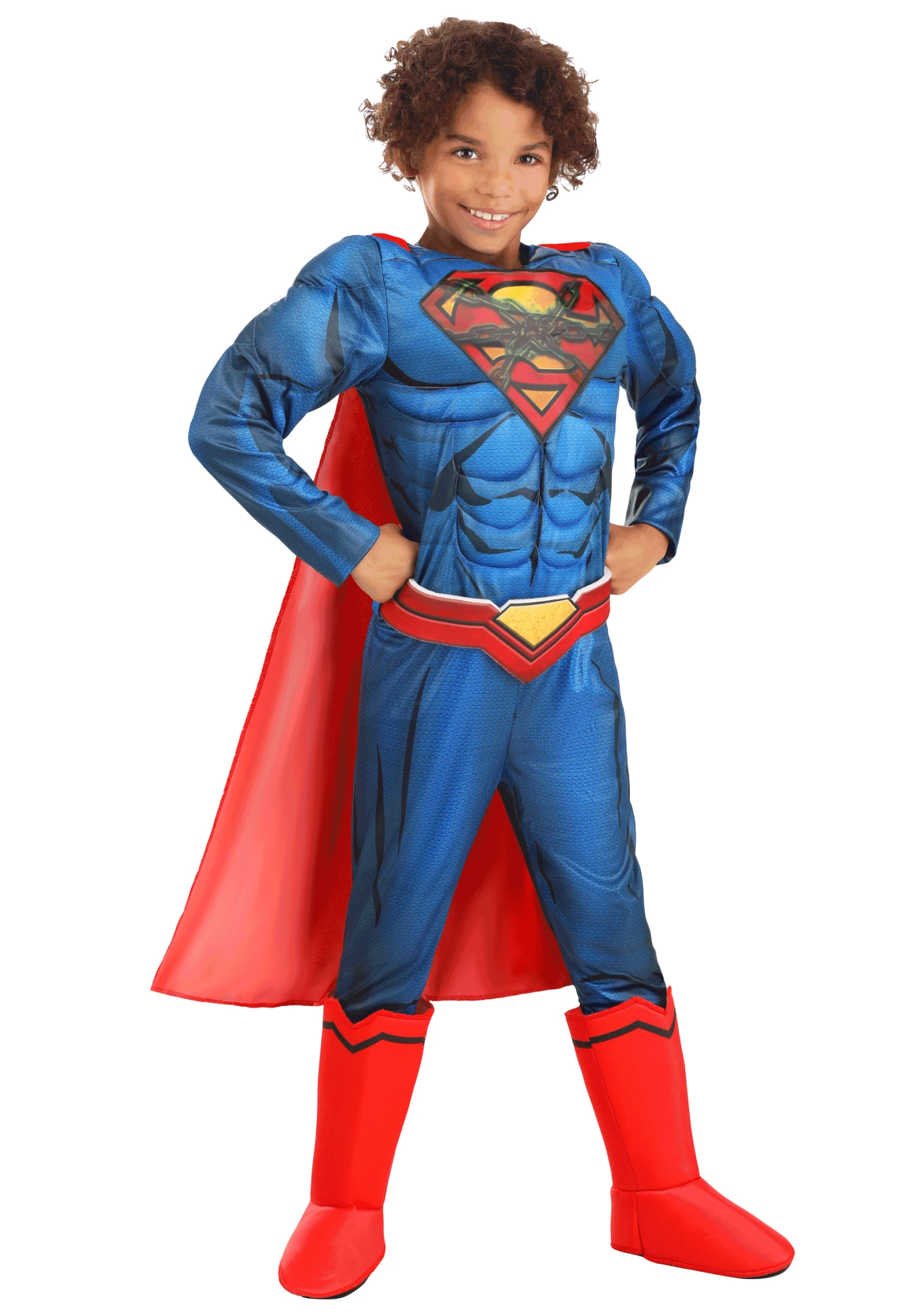 This DC Comics Superman Deluxe Kids Costume includes all the Kryptonian details that make a super suit great. The jumpsuit has hook & loop fastener in the back and has built-in fiberfill muscles to make you look you have super strength. The ‘S’ in the diamond pattern in the middle are the most iconic feature in all of comics, so you will be sure to get that awesome feeling of recognition. The cape adds that extra level of true-to-source Super-style that will make you feel like Superman himself!