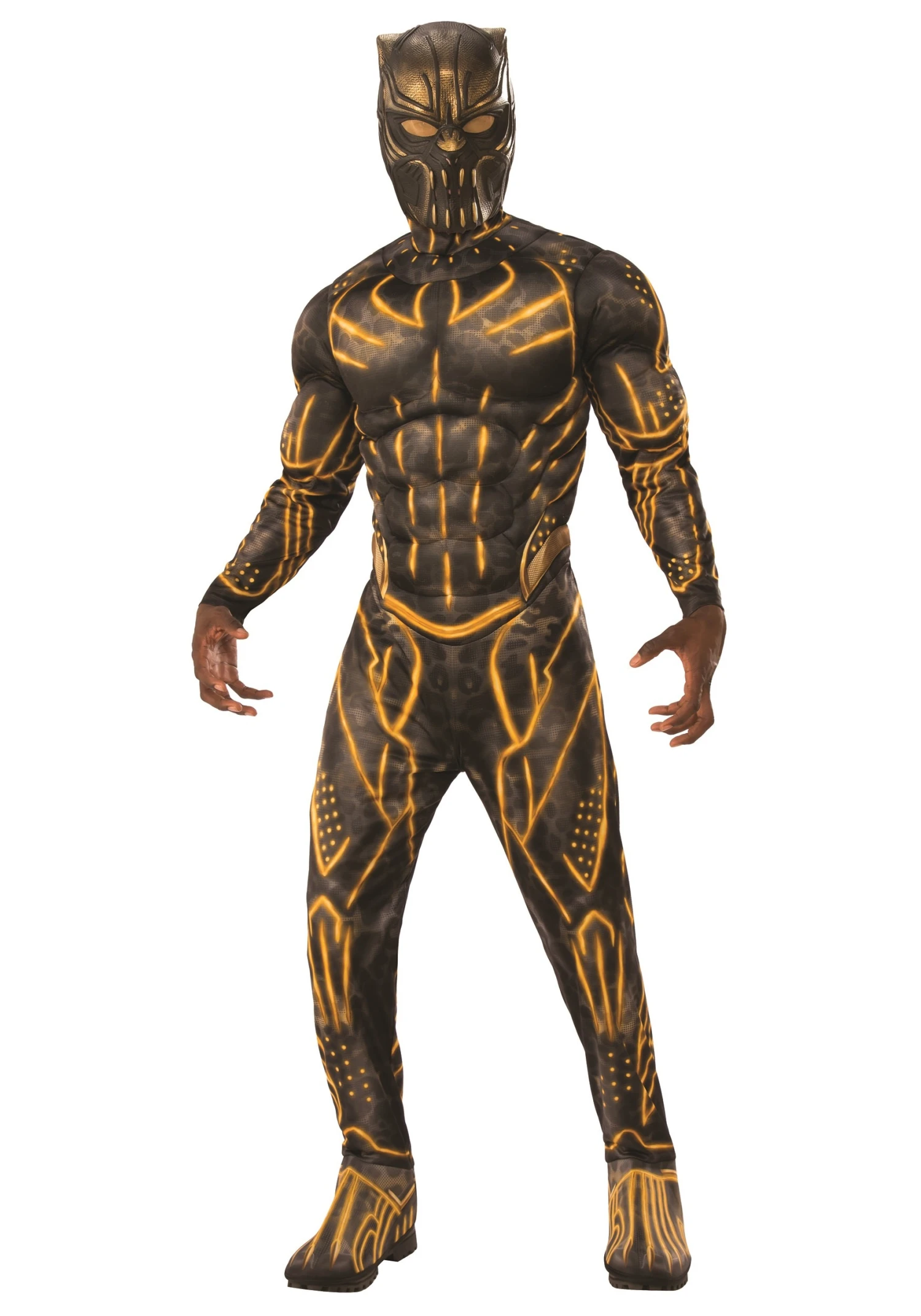 Rather than go through all of the wicked antics of Mr. ‘Trades in Murder’ from Black Panther, you can simply focus on highlighting his epic fashion choice when it comes to combat equipment. We’re happy to help with this officially licensed Deluxe Killmonger Battle Suit costume. This is a jumpsuit with fiberfill stuffing for the added musculature (until you get your hands on a heart-shaped herb). It is printed to look like the black and gleaming gold of Killmonger’s enhanced Panther Habit. Boot covers and a mesh mask complete your transformation into the Usurper King of Wakanda.Â