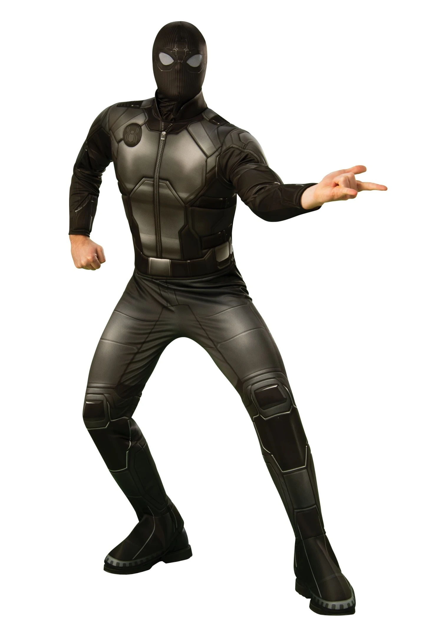 The truth is finally out. Spider-Man, for all his friendly neighborhood antics, is actually a ninja! It’s time to suit up in true style with this deluxe Black Spider-Man suit, officially licensed from Spider-Man: Far From Home. This black jumpsuit is designed to look like S.H.I.E.L.D.’s compromised offer to Peter. The suit zips up, has a tactical jacket collar, and features the Spider-Man logo on the shoulder. The mask has mesh eyes (instead of the more awkward flip-up goggles).Â