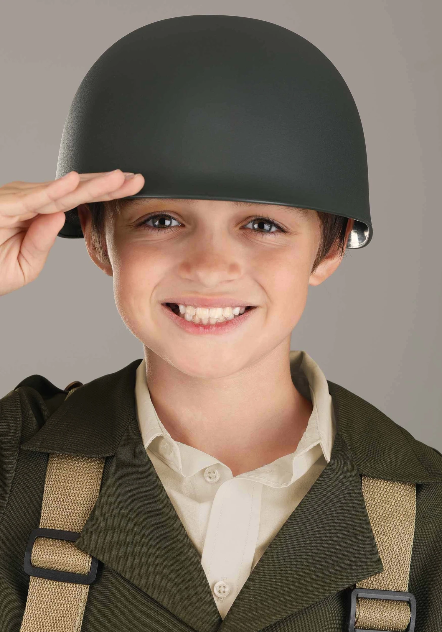 Make the day one to remember when you give your kiddo this Deluxe World War II Soldier costume for kids. This Made By Us ensemble starts with an off-green jacket inspired by the military look. Epaulets, angled pockets, and a value cuff provide realistic accents and the matching pants have a stretch waist for comfort! The belt has functional pouches and suspenders and the construction of the plastic helm tops off the look while staying firmly on your kiddo’s head.