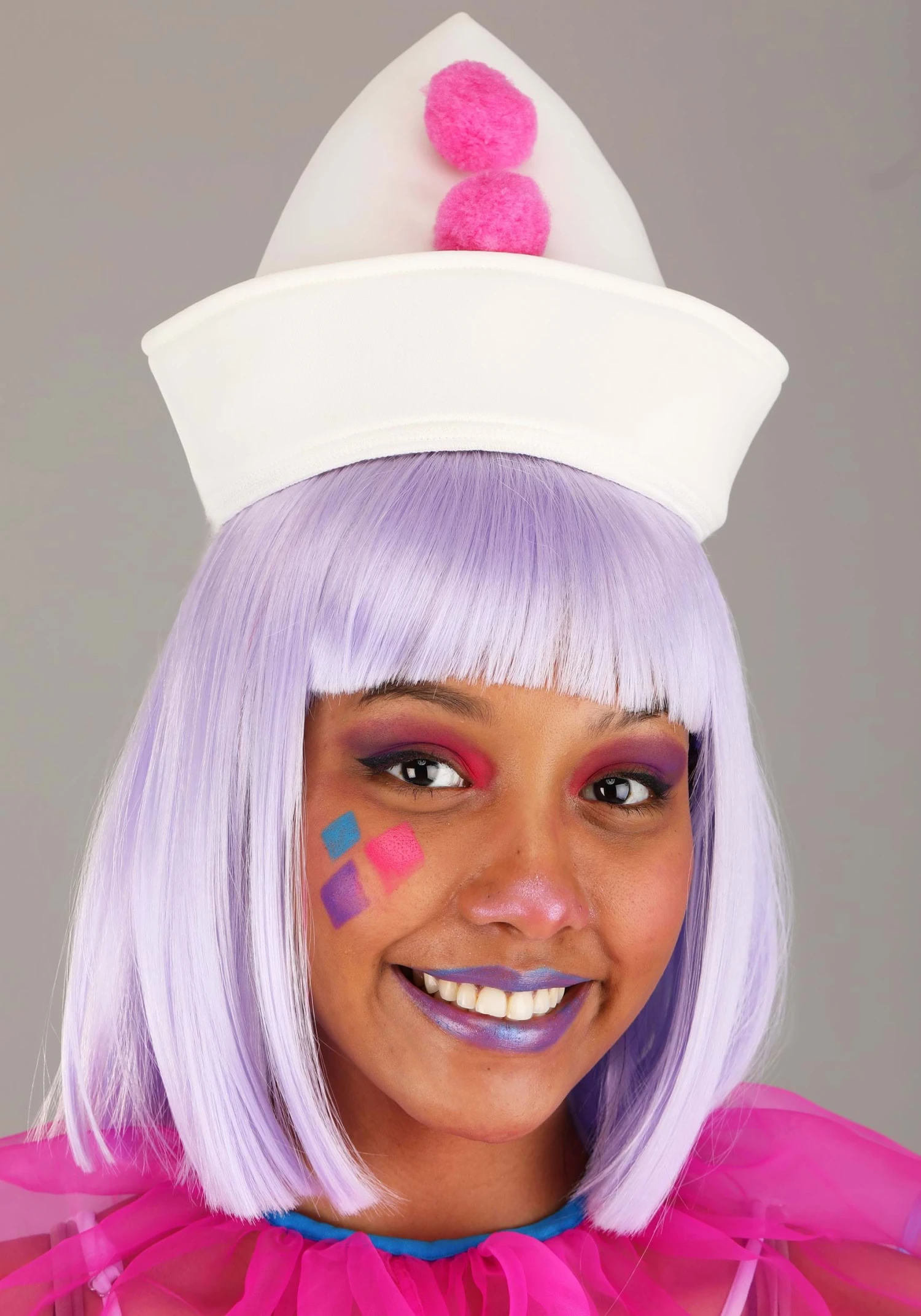 Thin adjustable shoulder straps keep the step-in jumpsuit secure. Meanwhile, a pink organza and blue satin trimmed collar pairs with matching cuffs to give the stylish jumpsuit a clownish look! Complete the look with the included hat and shoe clips. The foam-backed hat compliments the jumpsuit’s bright white color and pink pompom embellishments, while the shoe clips add similar pink pompoms to your preferred footwear!