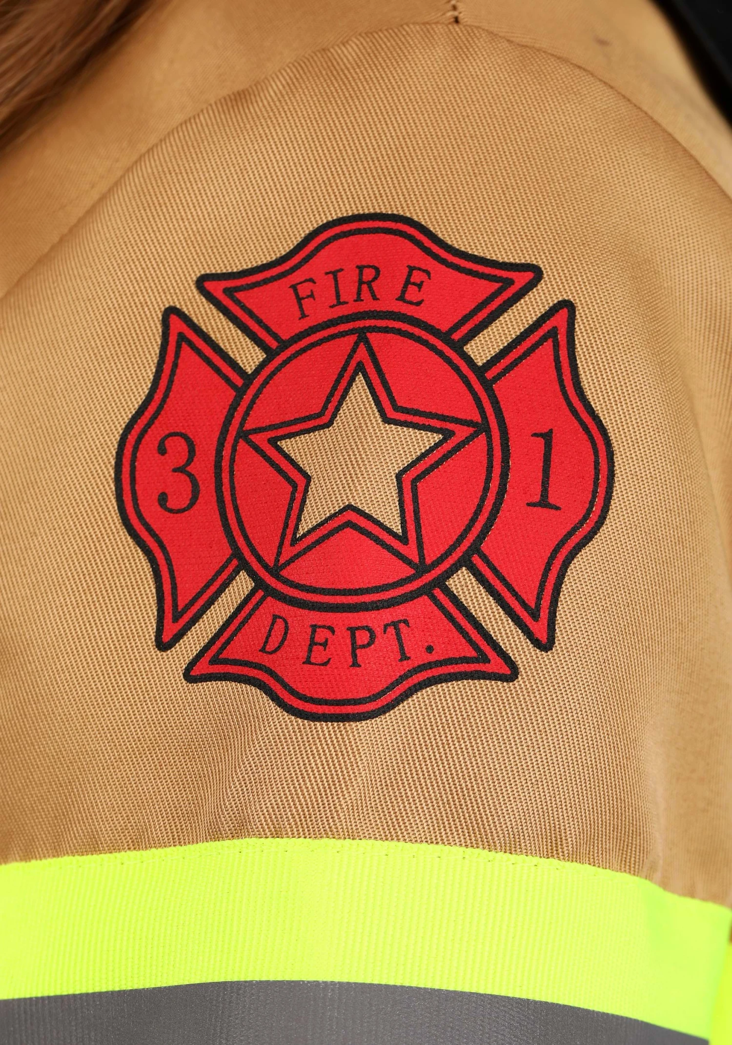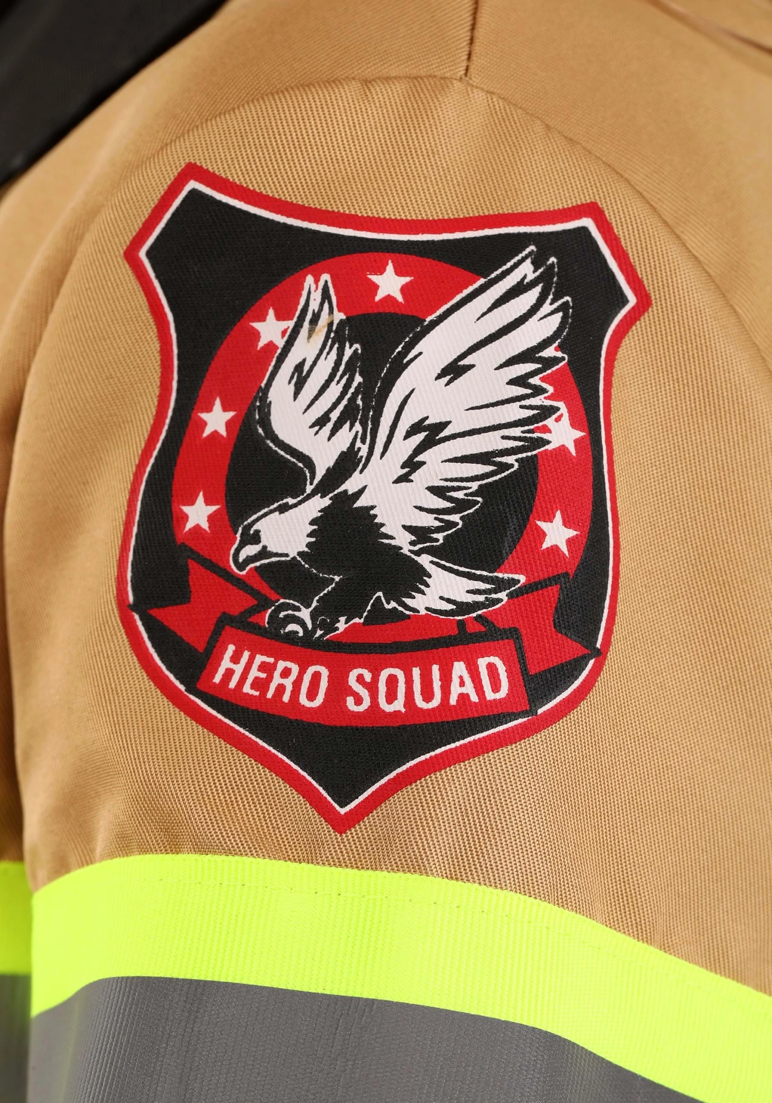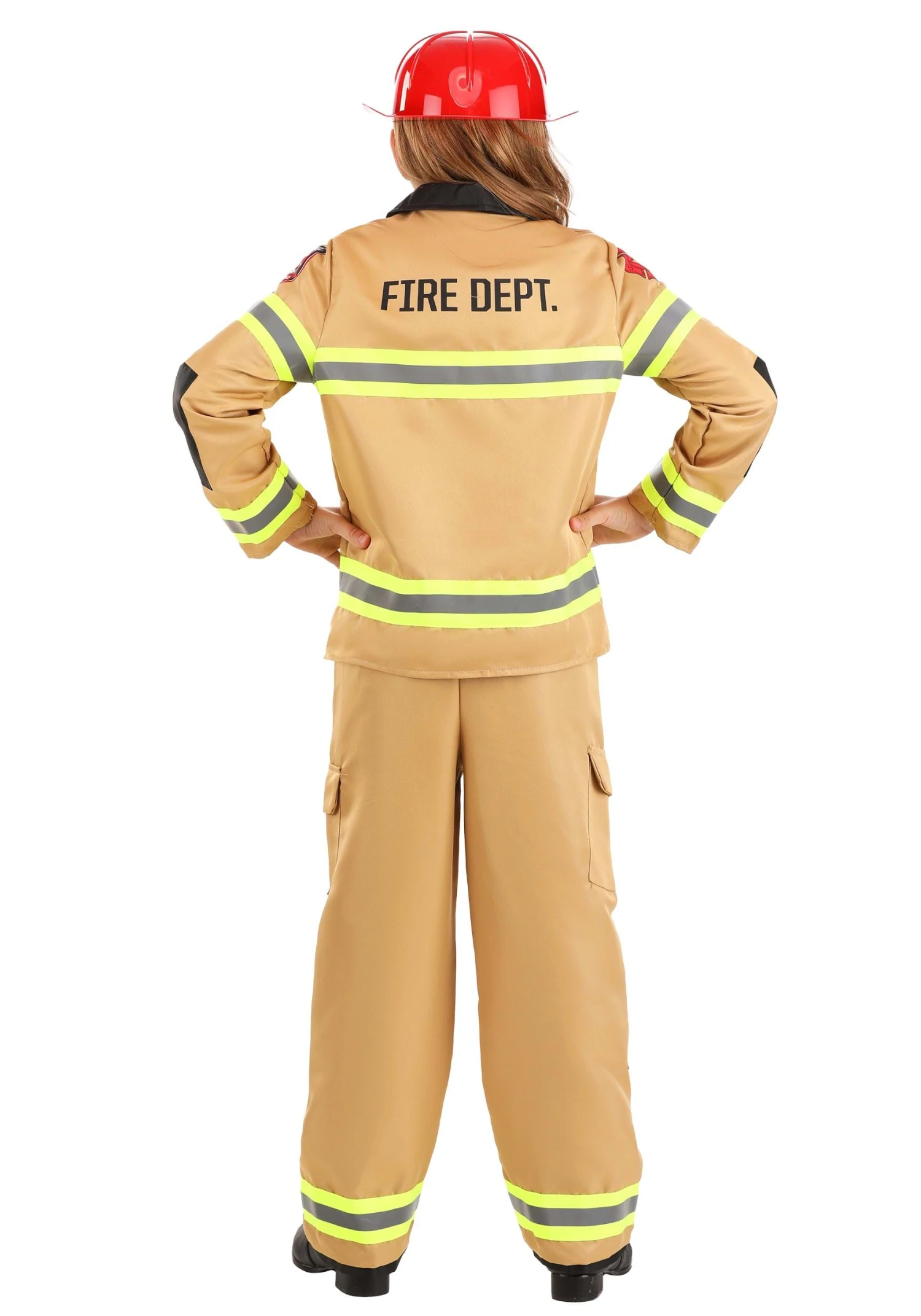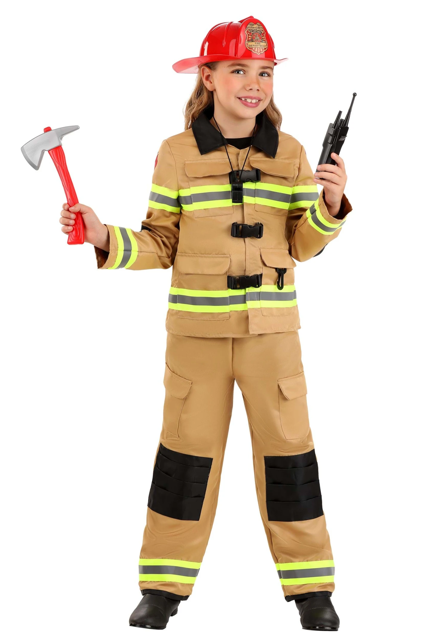 Answer the call and protect your community in this Firefighter Prestige Costume for Kids! The outfit includes a tan-colored jacket that is designed to look just like a firefighter’s jacket. Four pockets, a black collar, and black parachute buckles make it look extra official, as do the yellow and silver reflective stripes appliqued on the front, back, and sleeves. The same reflective tape circle the pants cuffs, and the knees are covered with black patches. There’s a pocket on each upper leg. The red plastic helmet with the printed badge finishes your look.