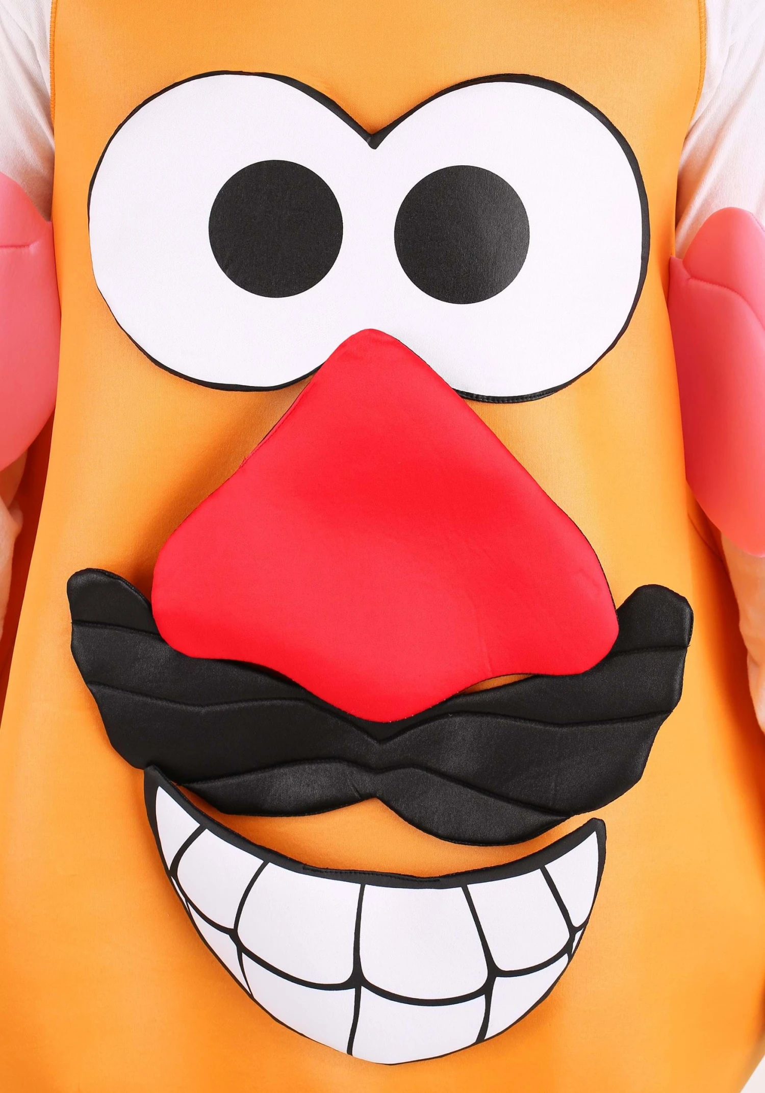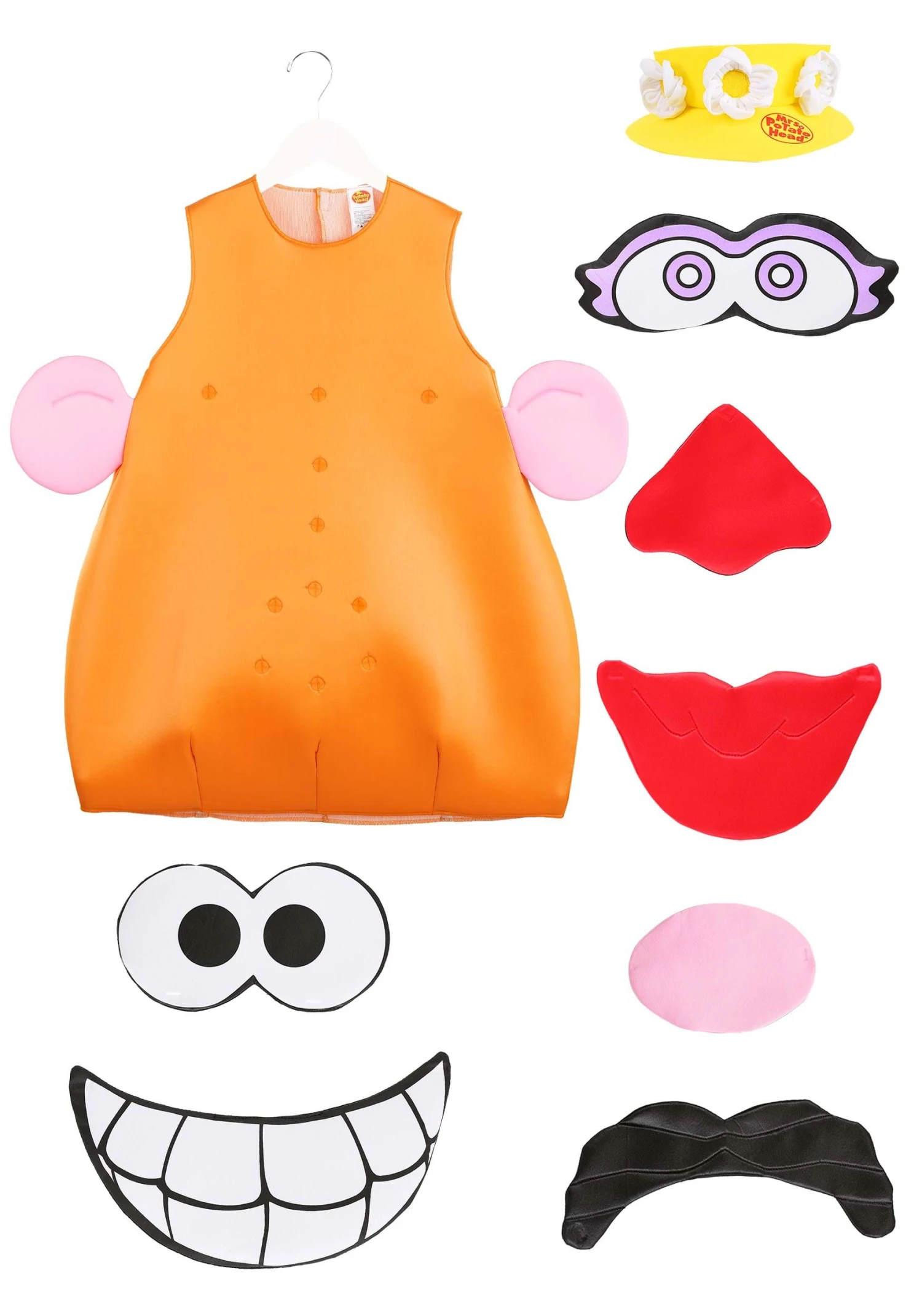 Put your best face forward with this officially licensed Mrs/Mr Potato Head Adult Costume! The outfit includes a sleeveless, foam-backed tunic made of brown polyester interlock-knit fabric. It fastens at the back and is roomy enough to wear over your preferred lightweight outfit. Fabric ears are sewn to each side of the tunic, but the other facial parts can be swapped around on the tunic as desired. The “female” set includes eyes with purple eyelashes, an oval nose, red lips, and a yellow flowered hat, while the “male” set includes round eyes, a red nose, a black mustache, and a toothy smile.Â