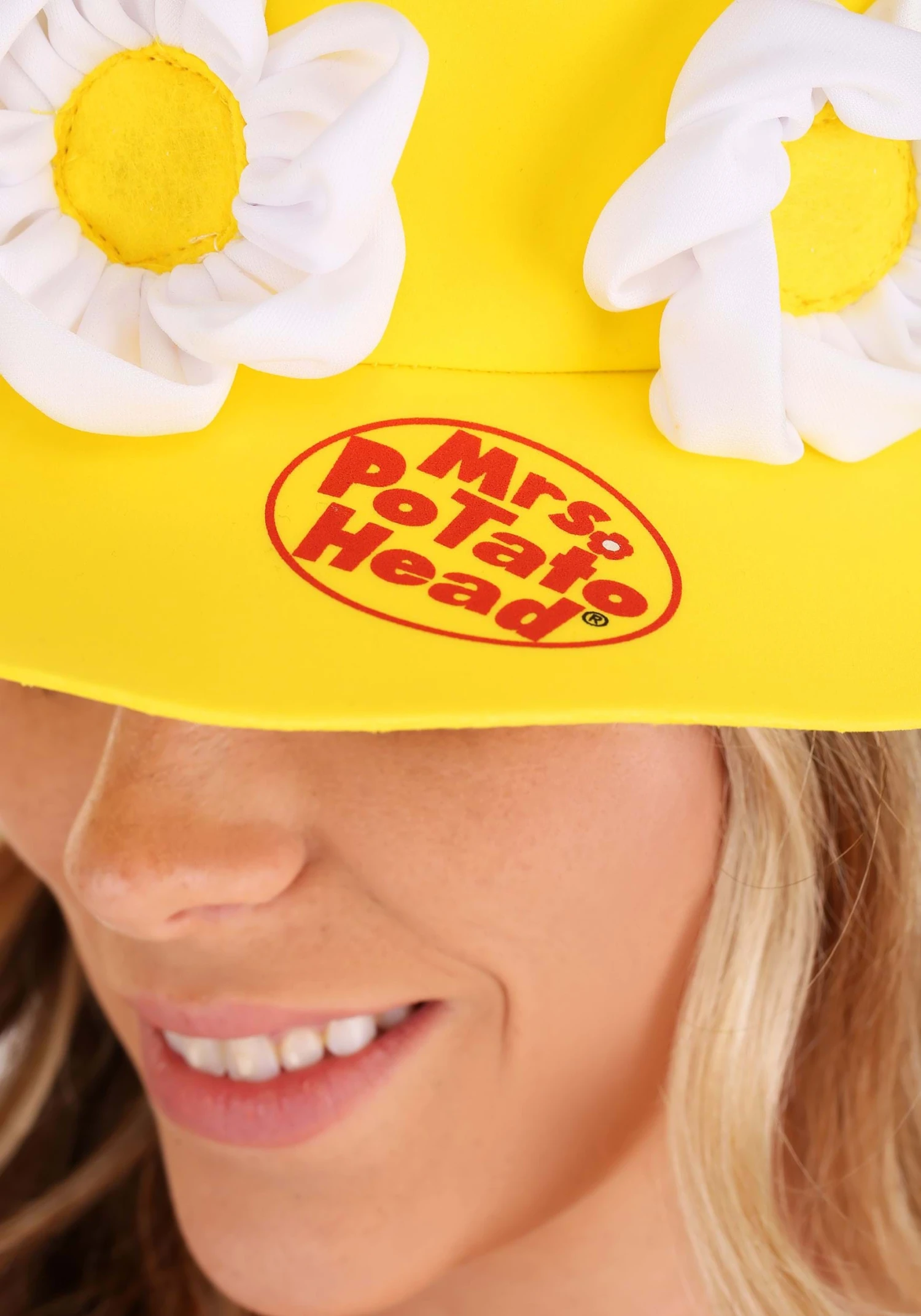 - Yellow foam hat has fabric flowers