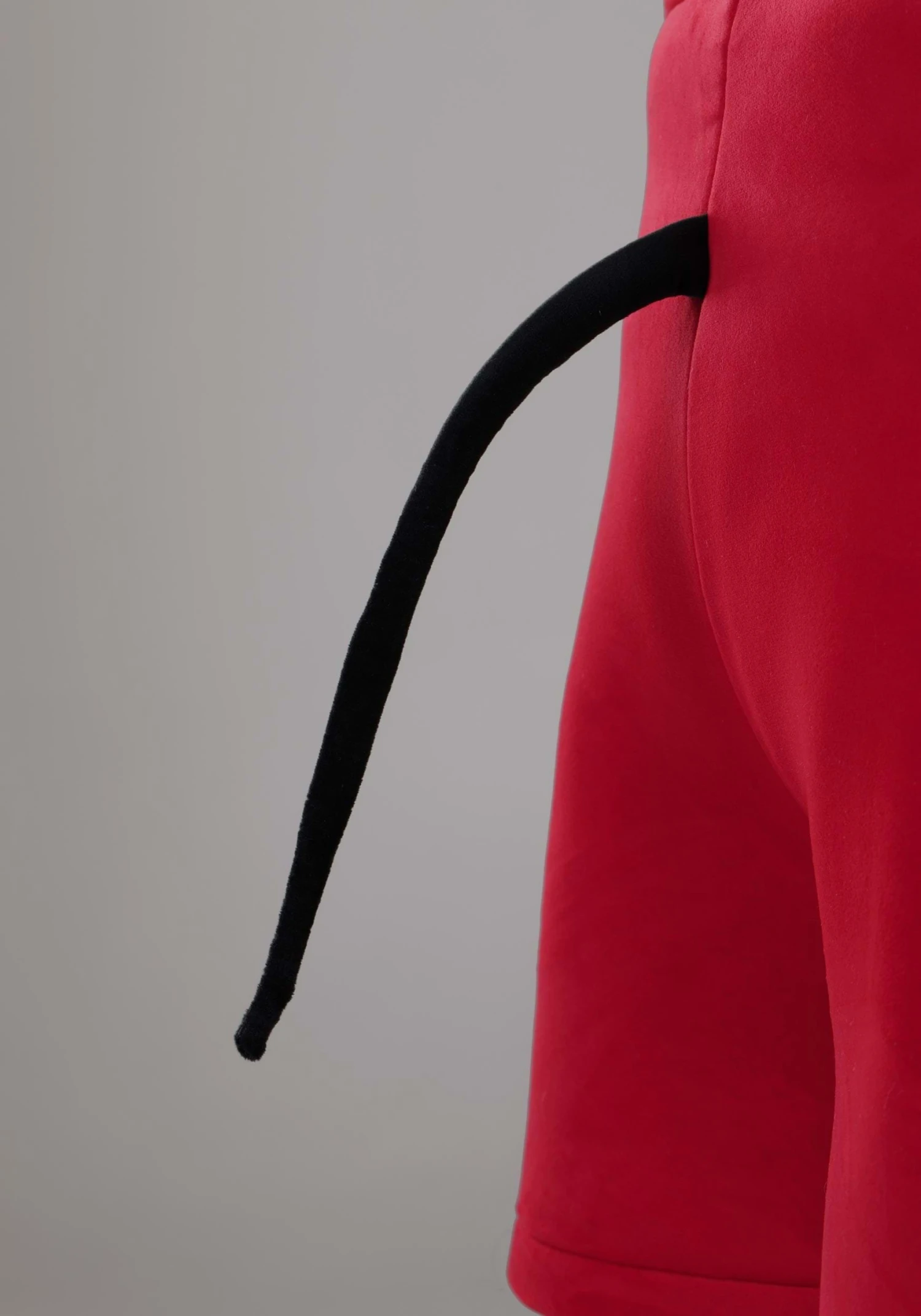 - Red cuddle plush shorts have foam backing, elastic waistband
