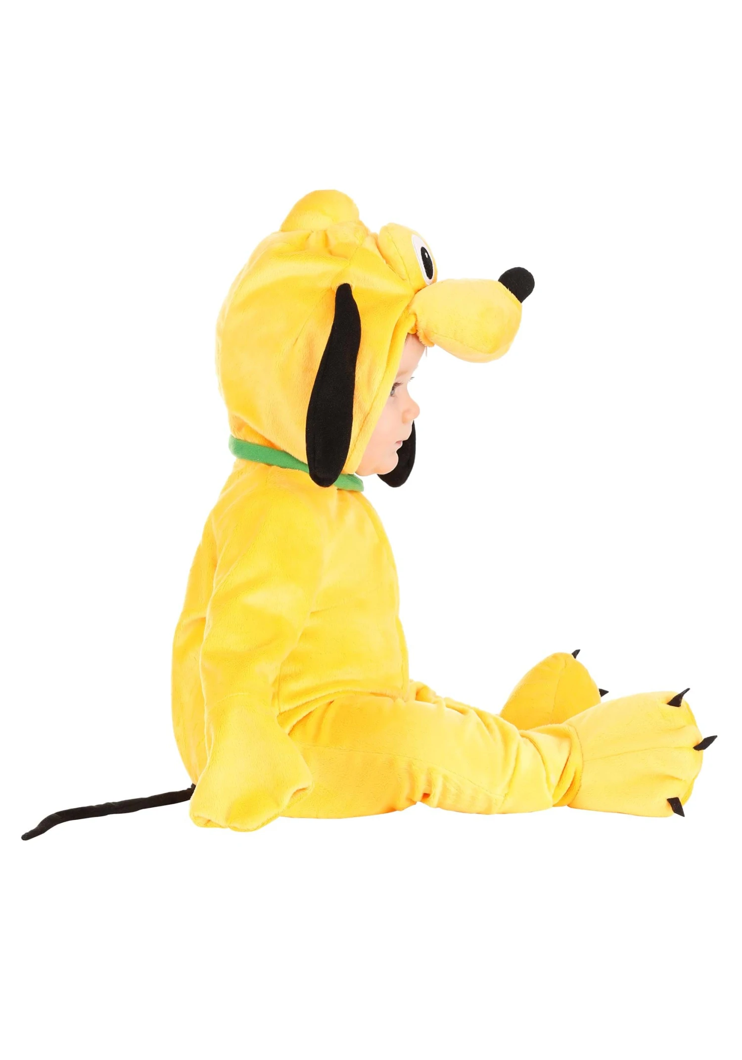 Make sure that your Disney dreams are complete when you buy this Infant Disney Pluto costume from Disney’s classic animation! This officially licensed Made By Us infant costume transforms your tiny tot into a cuddly Pluto with two easy-to-wear pieces. Start the transformation with the super-soft yellow velour hooded jumpsuit. Mitts designed like puppy paws are attached to the end of each sleeve and let you cover or expose your little one’s hands. A zipper located at center front makes getting in and out of the costume easy, while the neckline composed of green faux suede imitates a collar and puts a layer between the zipper pull and your baby’s chin. Meanwhile, snaps along the inseams make diaper access simple. The hood is soft-sculpted after Pluto’s adorable muzzle, complete with floppy ears and embroidered eyes. And a pair of paw-shaped booties complete the look and keep tiny toes cozy!