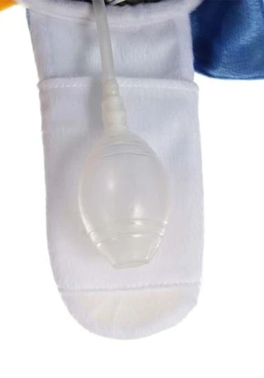 - Donald’s right arm has pocket for water bulb; tubing runs from bulb to character mouth