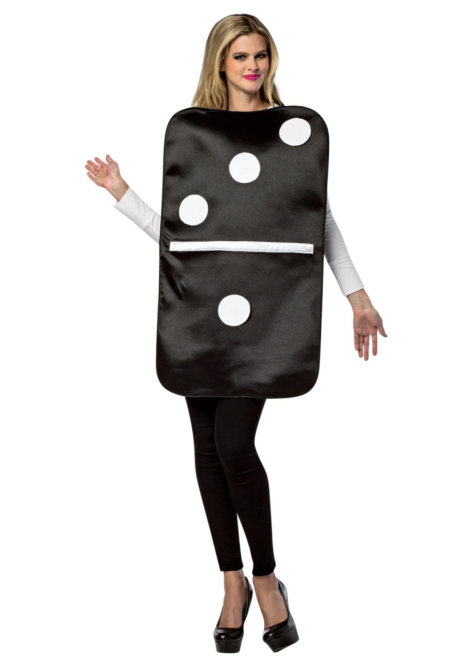 We’ve tried to think of all the things you can do in this Adult Domino Costume. So far, our best idea has been to form a novelty band that wears a matching set of these domino outfits and performs only covers of the Van Morrison song of the same name in different musical styles. Dub Domino, doom metal Domino, synthpop Domino, shoegaze Domino, krautrock Domino––the possibilities are endless. You could call yourself the “Falling Dominoes” or “Oh, Domino.” You’ll be the next Devo or OK Go for sure! But we’re pretty sure that you’ve got some plenty creative ideas of your own to pair with this costume. Like a life-size version of Domino Rally spread out across your city… okay, we’ll stop. We don’t want to make you feel bad about whatever you come up with. We’re sure it’ll be just as good as our ideas.