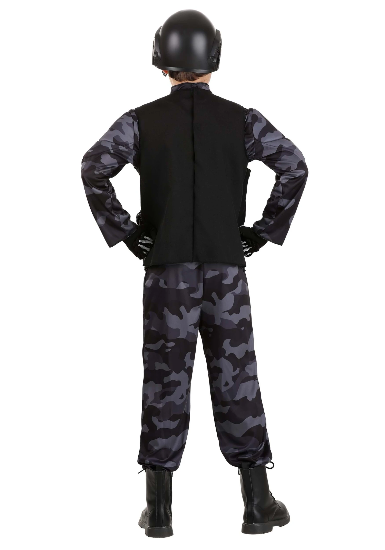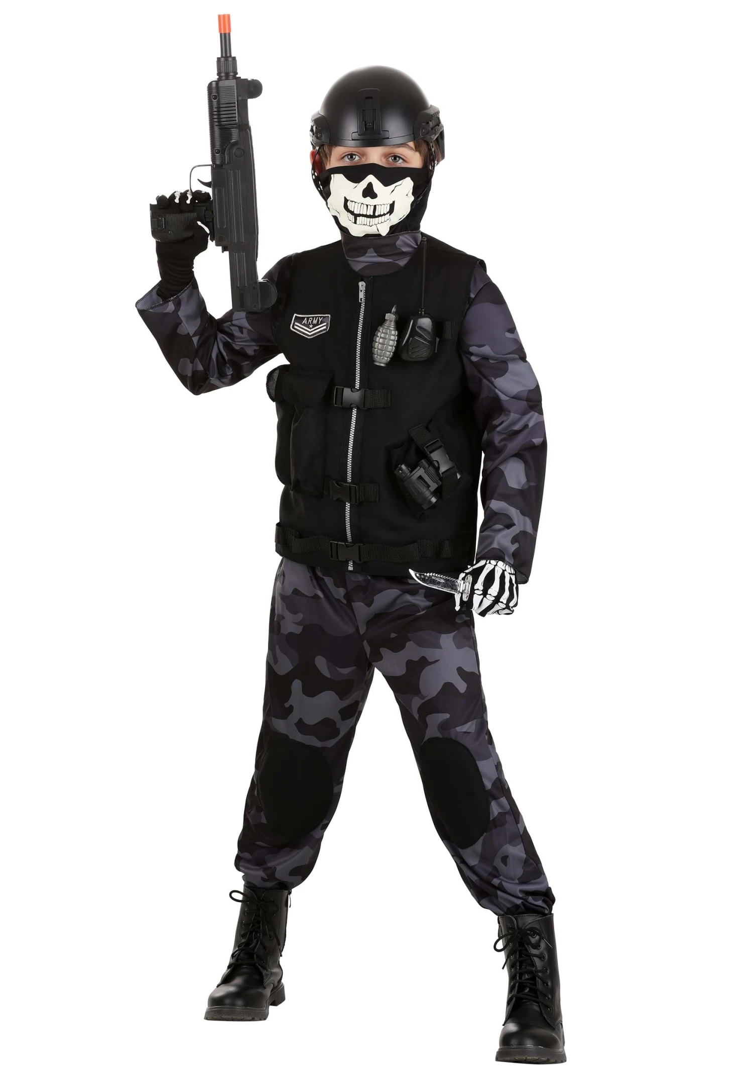 Suit up for fun with an exclusive Elite Army Costume for Kids! The unisex outfit includes a long-sleeved shirt made out of polyester jersey knit and printed with a gray and black camouflage pattern. The matching camo print pants have a comfy elastic waistband. The black poplin vest zips up the front and features decorative parachute buckles, an embroidered “ARMY” patch on the right side of the chest, and plenty of pockets for holding treats or accessories. A black plastic helmet and a black mask printed with skull details help to hide your face. The black gloves are printed with white bones.Â