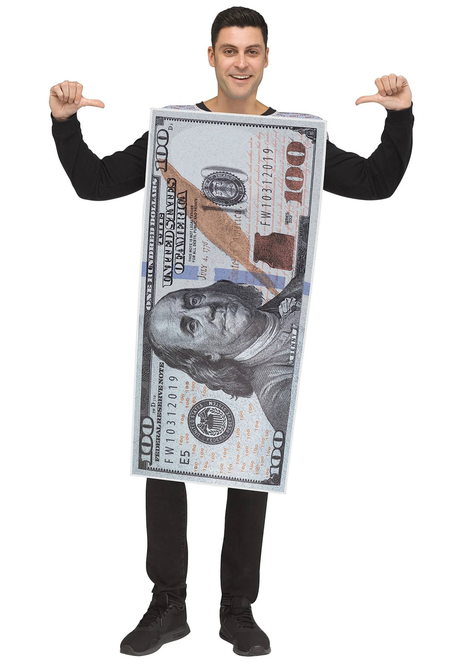 This Adult 100 Dollar Bill Costume is a simple costume to help you look a little more like a hundred bucks! The costume comes with a tunic-style top, which is made out of a polyester foam material. The front and back both have a realistic image of a hundred dollar bill printed onto it, complete with Benjamin Franklin’s face in the middle. It comes with generous openings in the side for your arms and you can wear your favorite shirt underneath it. All you have to do is slip it on and you’ll be cold hard cash in an instant!