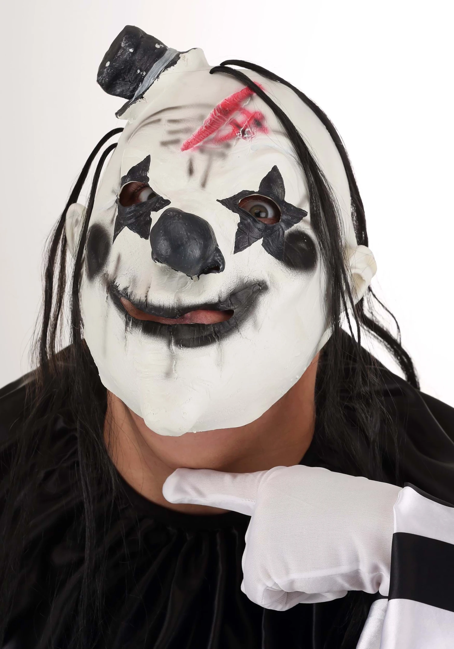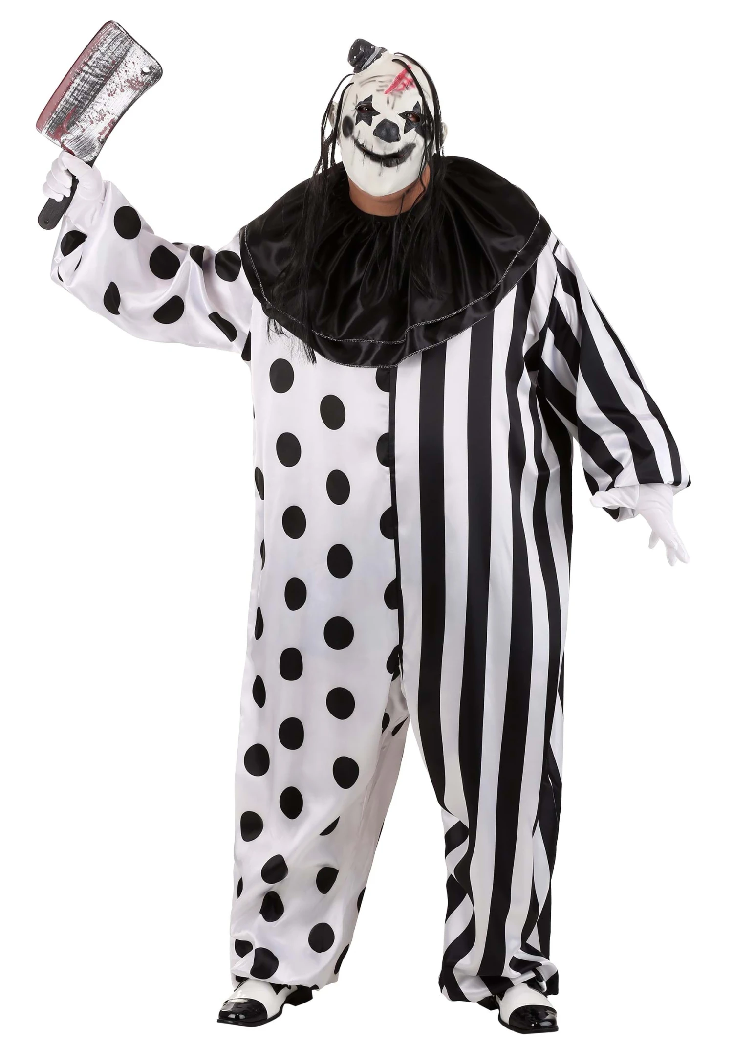 The wide ruffled satin collar, which ties gracefully at the back, provides the perfect frame for the coup de grace: a full-head molded costume mask made out of latex. With its chillingly attached hat and eerie thin strands of synthetic hair, it’s clear this is no ordinary clown. Designed generously for those up to 6’2” and 300 pounds, this plus size ensemble ensures a fit as flawless as its design.