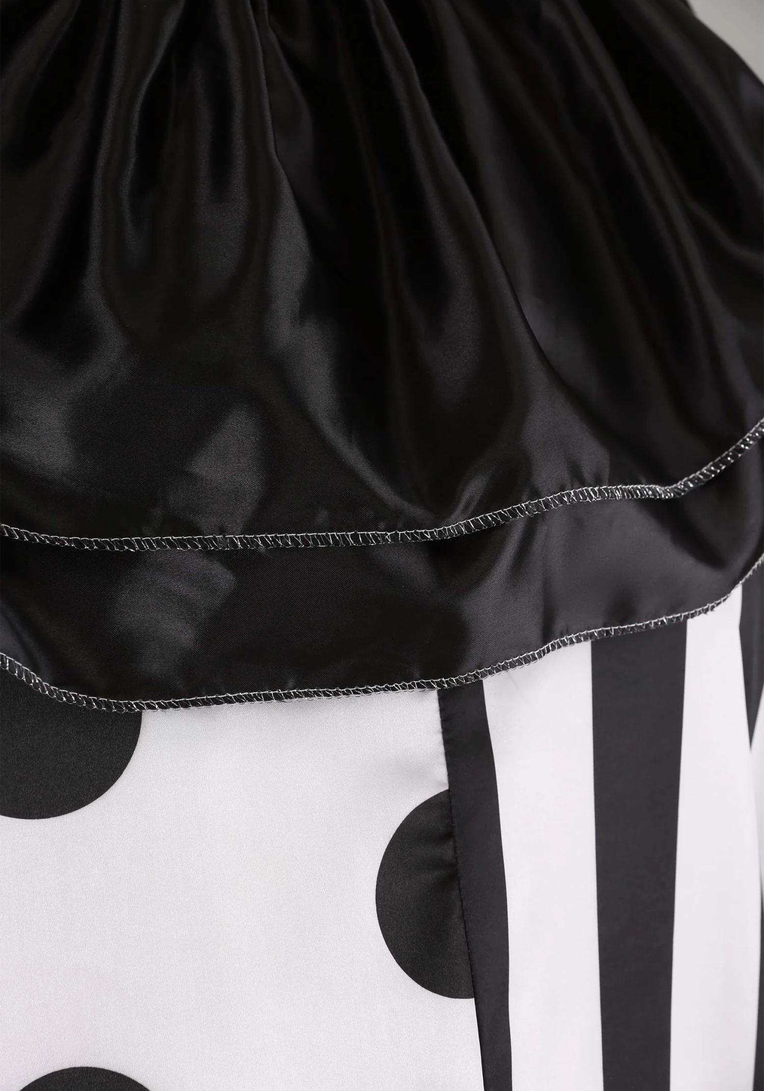 Crafted with meticulous precision from 100% luxurious polyester satin, this jumpsuit showcases an unsettling dichotomy: one side draped in bold stripes, the other adorned with playful polka dots. Yet, don’t be fooled by its seemingly innocuous exterior.