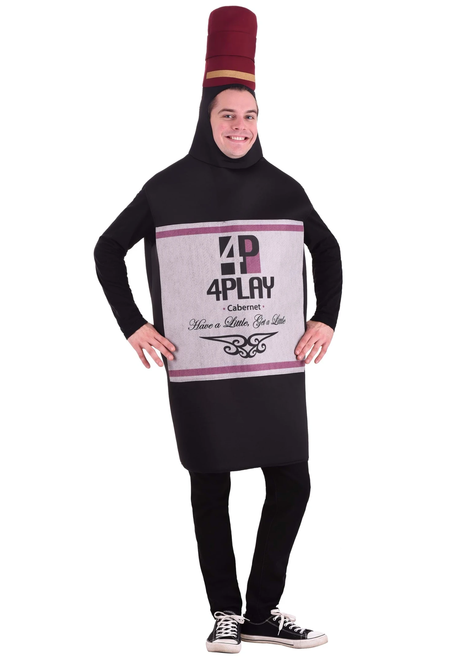 The yellow cheese wedge is served on a pair of suspenders with its own special knife, since some people consider it poor manners to assume the host will provide one. And because couples costumes are always better with a little double entendre on the side, the Cabernet tunic comes with a realistic label detailing its risque provenance!