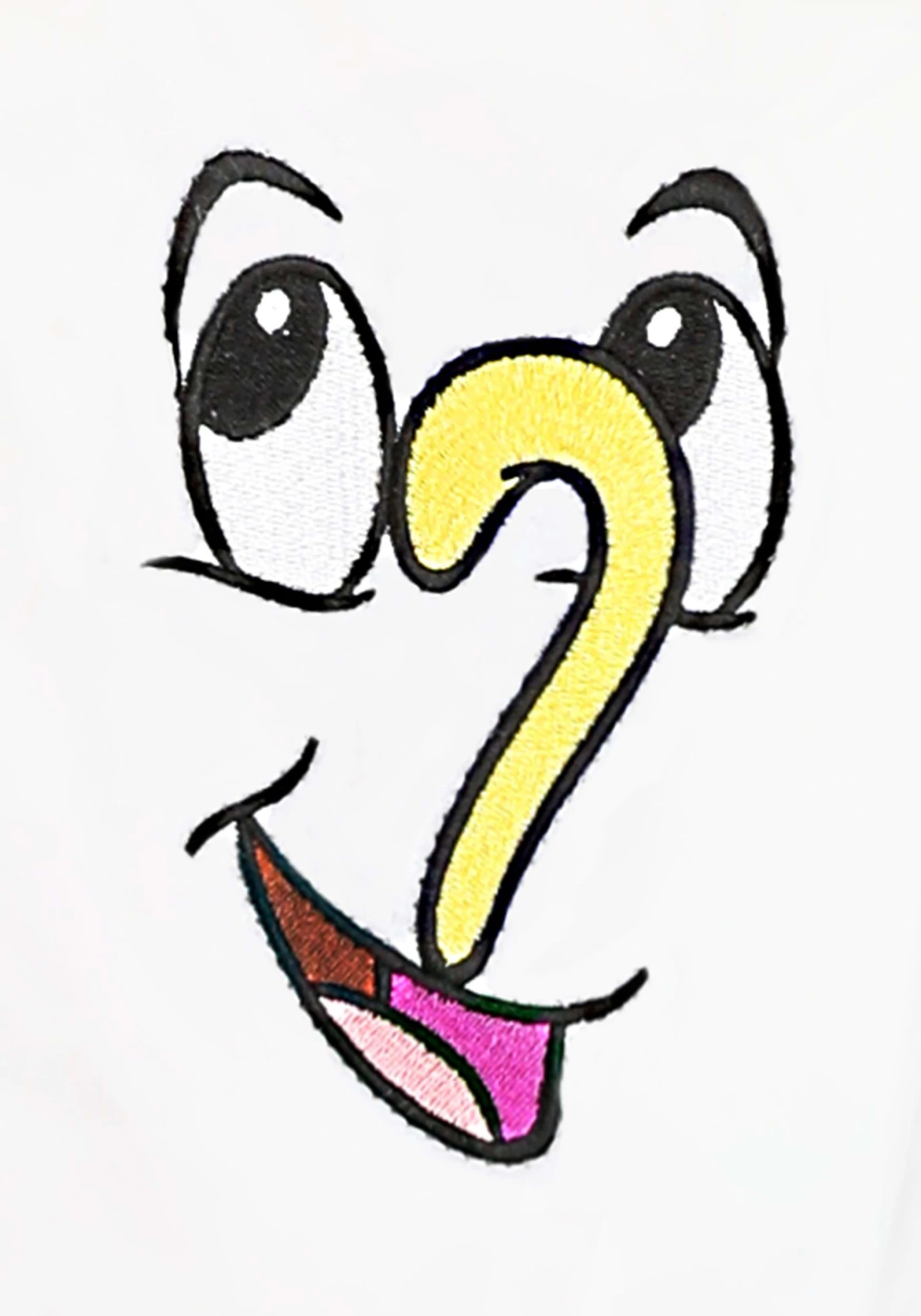 - Bodice is stiffened to flare outward like a teacup, with gold edging and embroidered face on front
