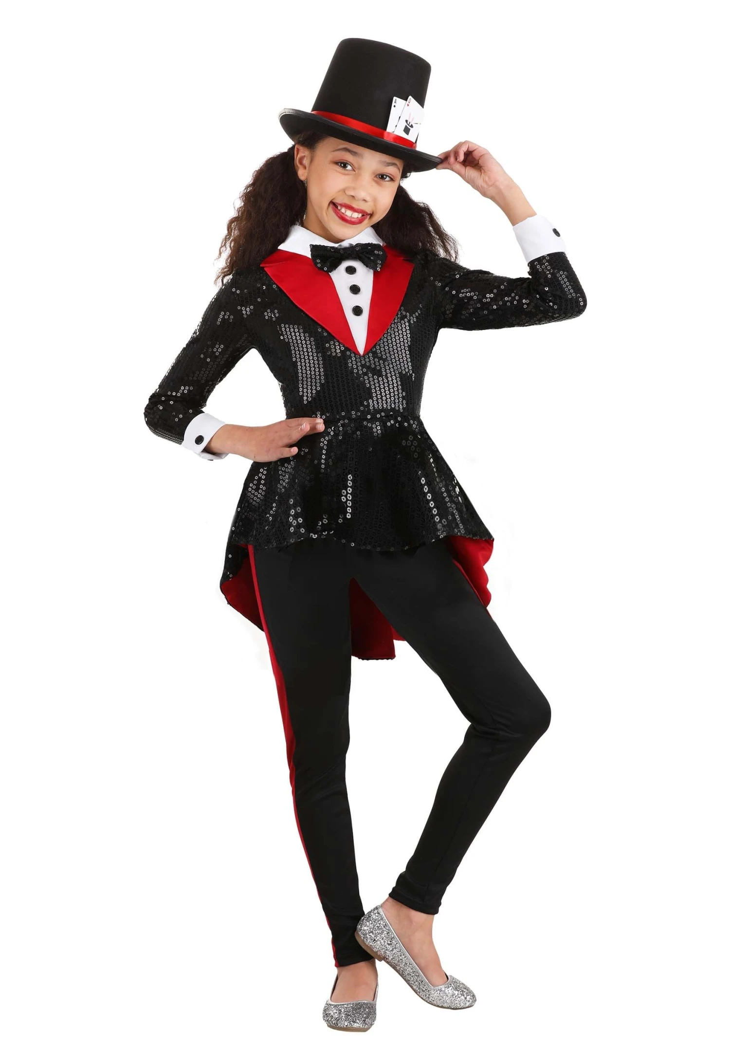 Dazzle your audience in this Girl’s Exclusive Magician Costume faster than you can say, “Presto, change-o!” The show-worthy outfit includes a top designed to look like three separate pieces. The long-sleeved tunic is styled after a suit jacket, with an elastic waist, long sleeves, and an inset with red lapels, an attached white dickey, and decorative values. A sequined bow tie is sewn to the collar. The comfy black pants have red stripes up each leg and the top hat features a red satin ribbon!Â