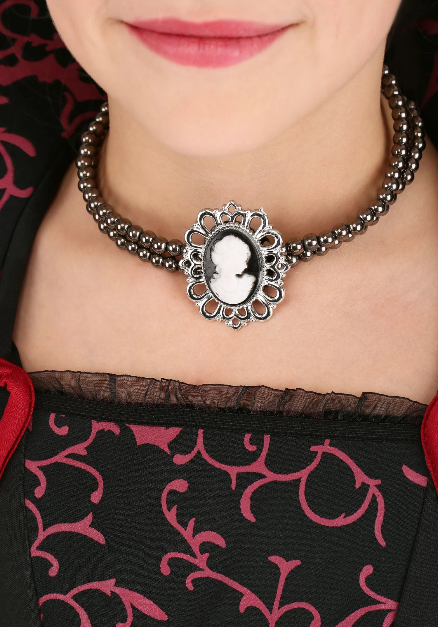 With burgundy and black color themes, this dress is likely to be packed into her travel bag, even if she has to leave all her other clothes behind just to make room! And that’s good, because this look will have her fitting in with the rest of the vampires in the neighborhoods you visit, so if you need to stop and ask directions she’ll look like a local. She might have so much fun pretending to be a vampire, that you might find yourself heading back to Transylvania sooner than you expected!