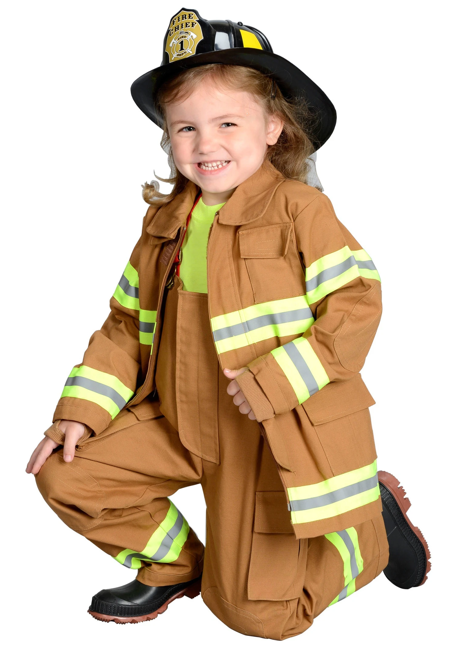 His eyes will widen at the sight of the super authentic tan overalls and jacket and their blazing yellow and white reflective stripes. The plastic fireman’s helmet will also look very official atop his head when he’s “working” and will similarly inspire enthralling dreams while he dozes beside it at night. There’s only one thing missing from this realistic kids firefighter costume…and that’s the fires to put out. But not so much as a stray spark escapes the watchful gaze of your little one, so we’re good with that!