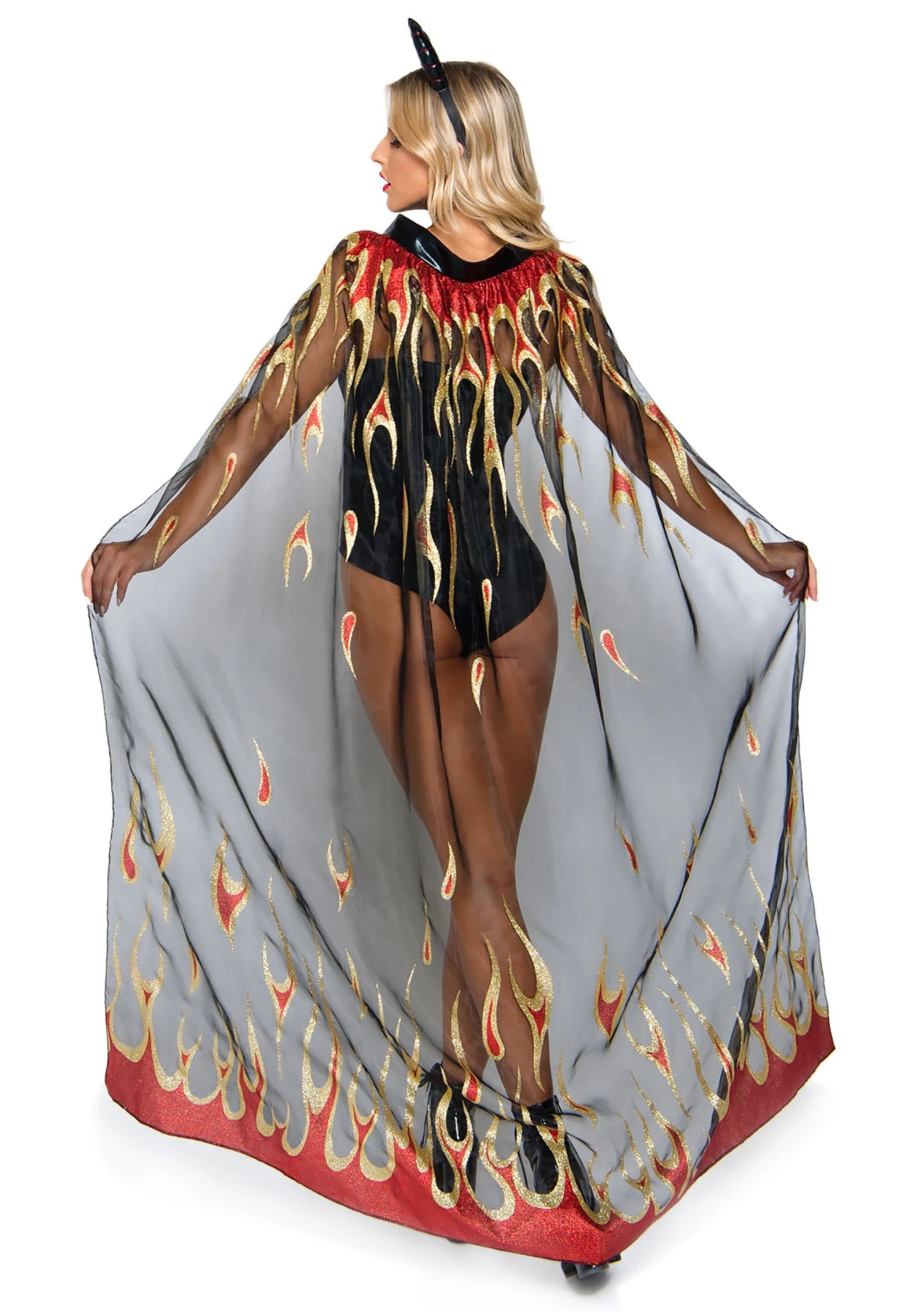 - Sheer organdy cape has printed glitter flames