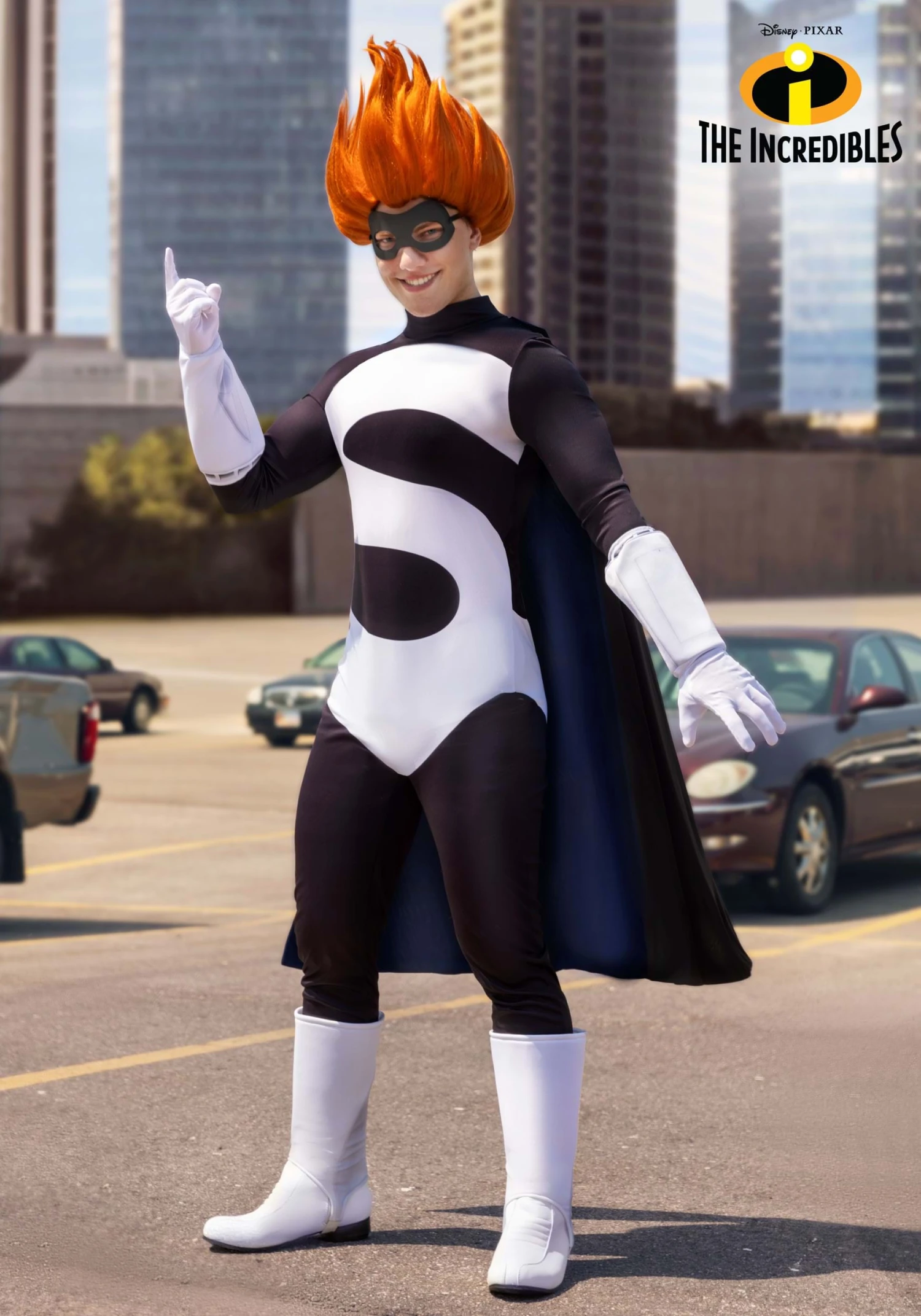 Our Made By Us design team created this look inspired by the villain of the Parr family’s first heroic movie! Step into the black and white jumpsuit which features long sleeves, a bold S design on the front, and hook and loop patches to fasten the Syndrome cape! Foam backed boot covers and structured gauntlets add to your accessory game while the bright Syndrome wig and eye mask complete your transformation!