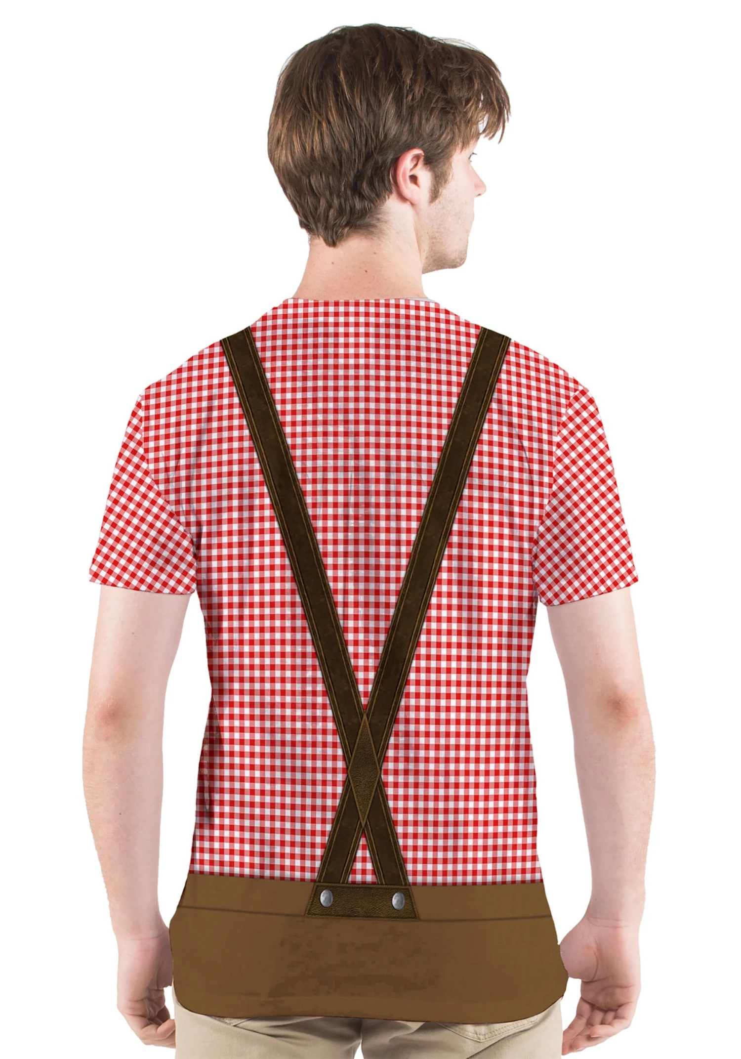 Next time you’re convincing people to join you for a weekend of polka, pretzels, and pilsners rock this lederhosen t-shirt. It has all the comfort you would want while also rocking a printed traditional checked collared shirt layered under realistic looking lederhosen straps. No need to sweat in leather pants when you’ve got a convenient option like this one on hand!