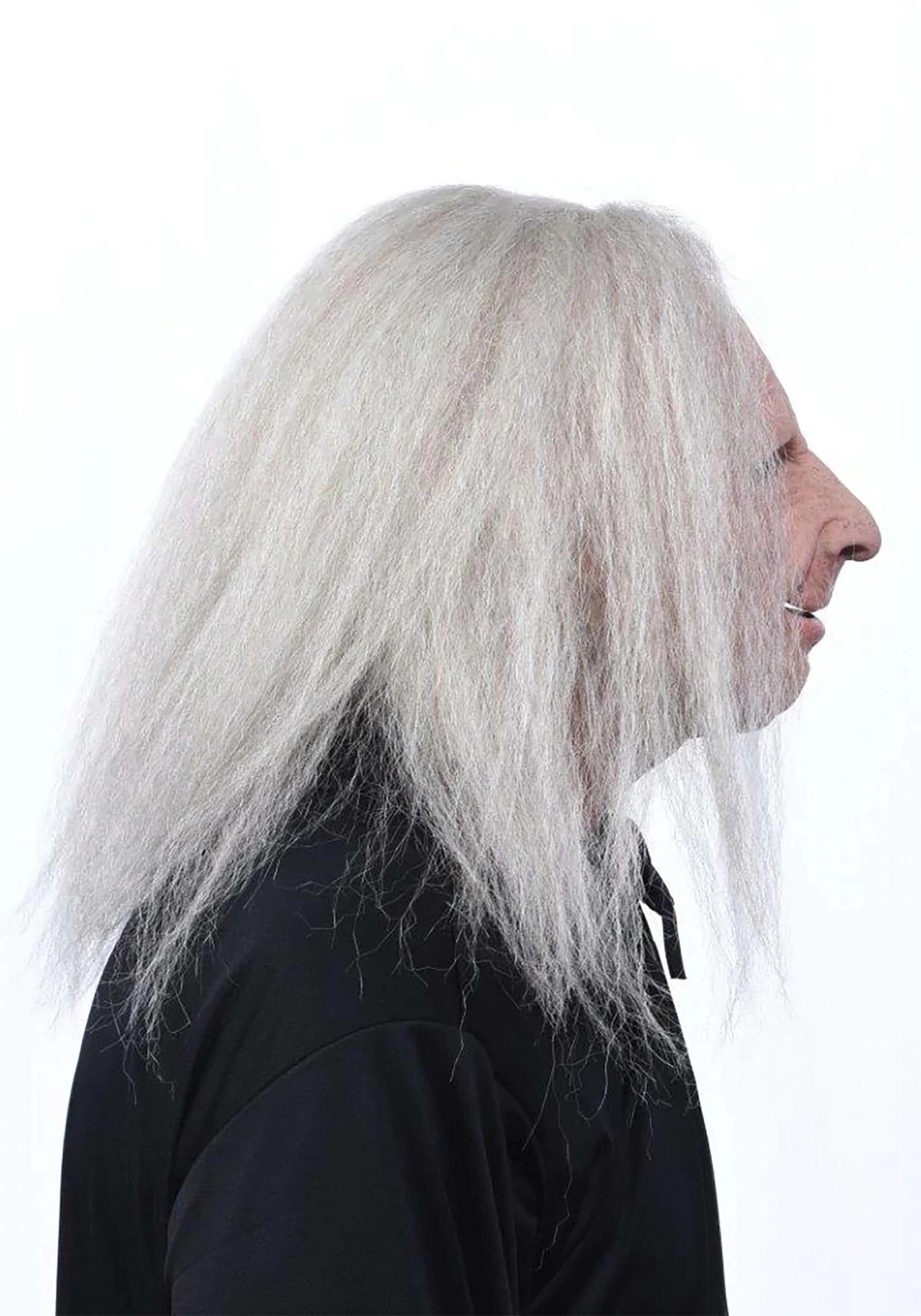 Act your age in this Old Lady Florence Wig! The molded latex mask is attached to a shoulder-length wig of light grey synthetic hair styled in a center part. The mask itself is painted and styled realistically with plenty of wrinkles, a mouth that’s twisted upward in a half-smile, half-sneer, and eye holes so that you can see where you’re going.