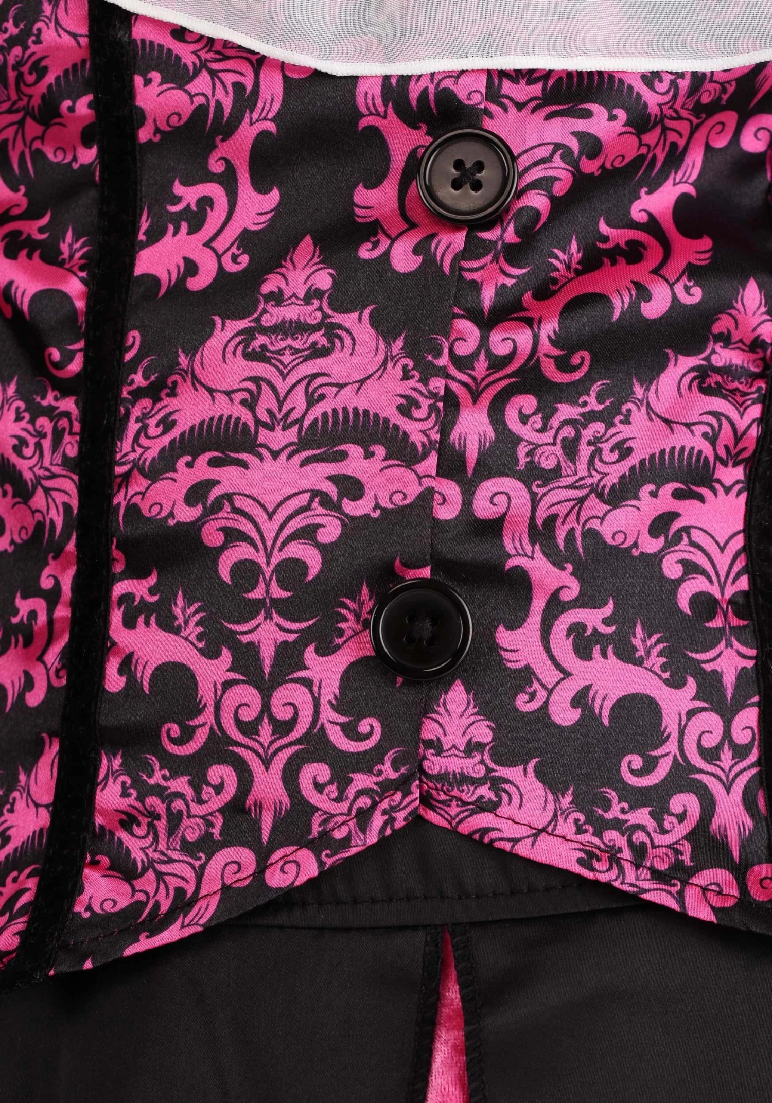Your favorite little ghoul will howl with excitement when she wears this exclusive Pink Vampire Costume! The dress is a delighful mix of old fashion made new, with a pink and black brocade-detail waistcoat attached to a shimmery pink skirt. A frothy white collar with an accent bowtie is the last word in sophistication. The sheer black sleeves are printed with whimsical flying bats. And speaking of bats, this vampire princess has an amazingly floaty black bat cape that flutters behind her with every movement. She’ll be the sweetest sight at the Monster Mash ball!Â