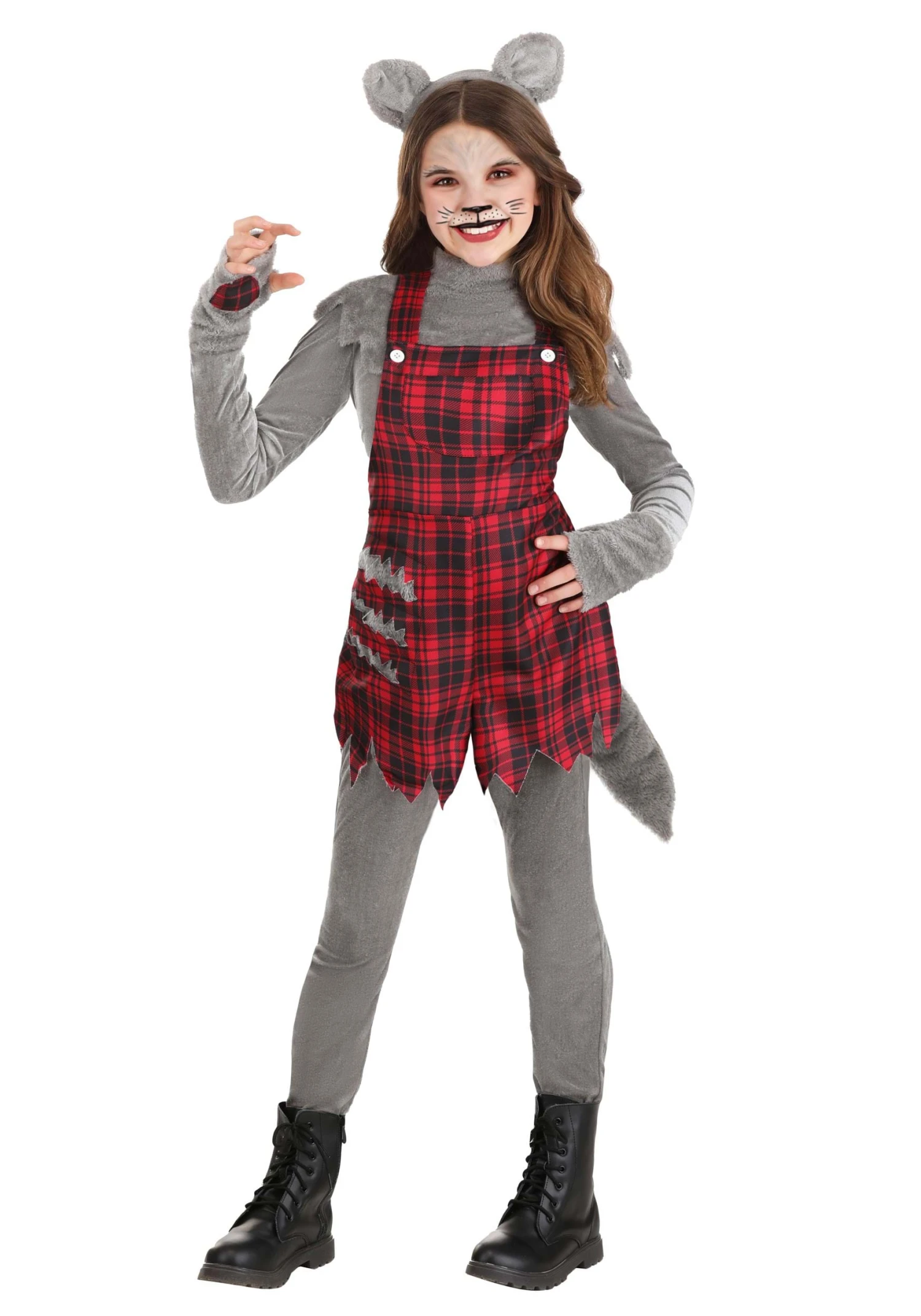Super-soft grey materials shape a pullover long-sleeve shirt and pair of coordinating elastic waistband pants. Grey, low-pile faux fur is used for an attached collar overlay, fingerless gloves, tail, and wolf ear headband, ensuring the costume has a wolfish look. Red-and-black plaid shortalls secure over the grey base with hook-and-loop fasteners on the side, while intentional distressing adds a wild and unique style that’s sure to inspire countless new tales!