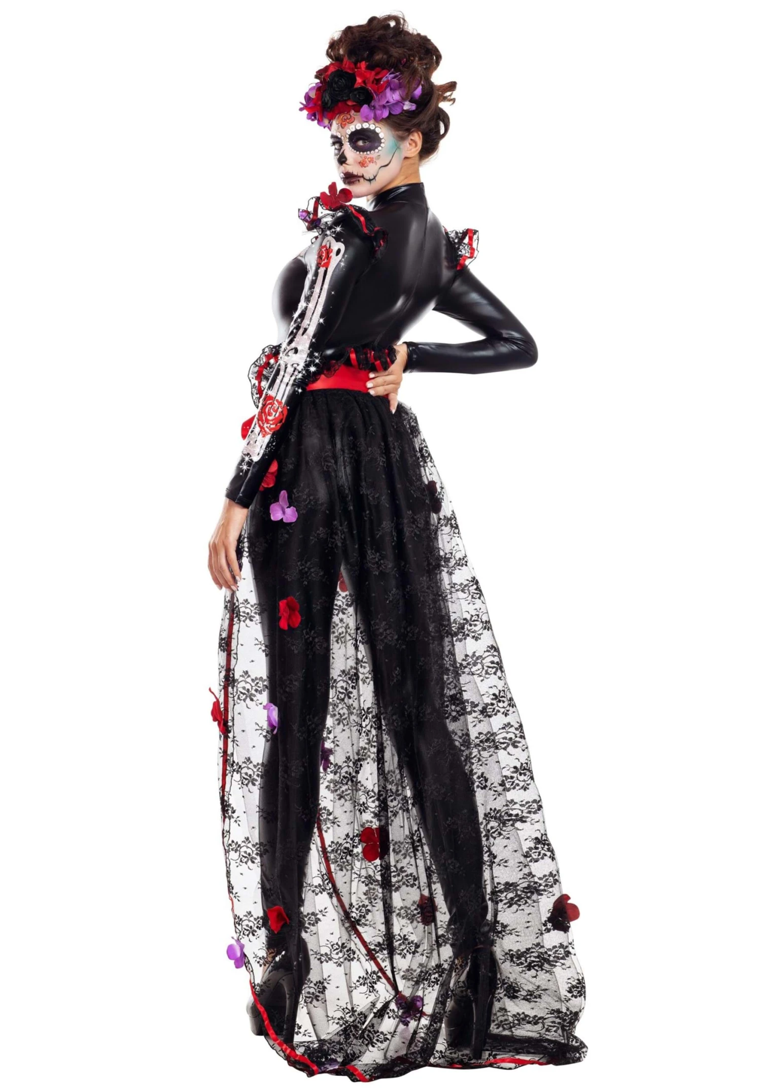 Be the most fashionable spirit in this world or the next while you wear your Plus Size Rosas Day of the Dead Costume! The outfit includes a comfortably form-fitting black jumpsuit that fastens up the back and has faux flowers sewn to the shoulders. The front is printed with a realistic skeleton body that’s been embellished with glittery details as well as rose images. It comes with a floral headband and a long, open-fronted mesh skirt that ties at the waist with a red ribbon sash.Â
