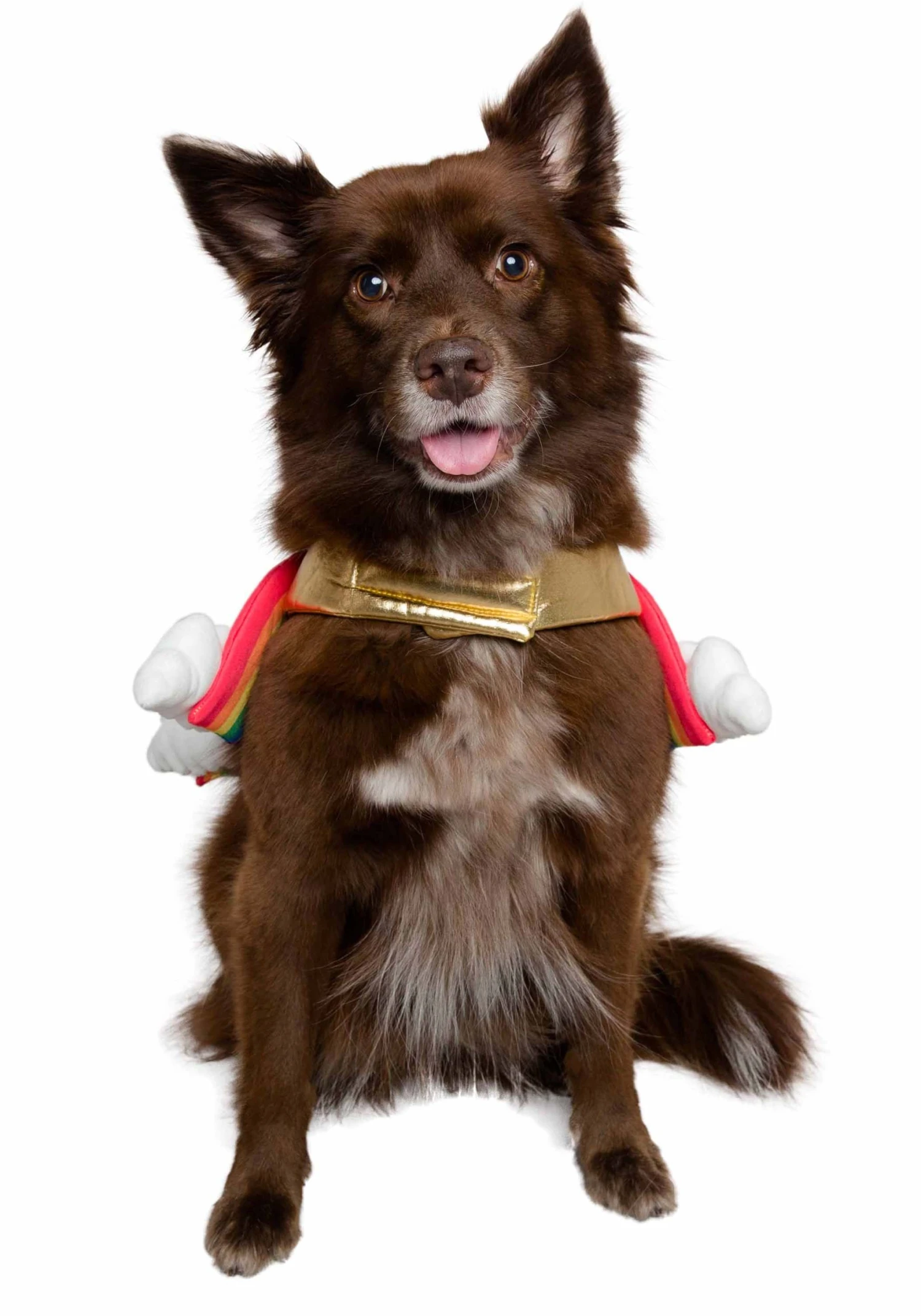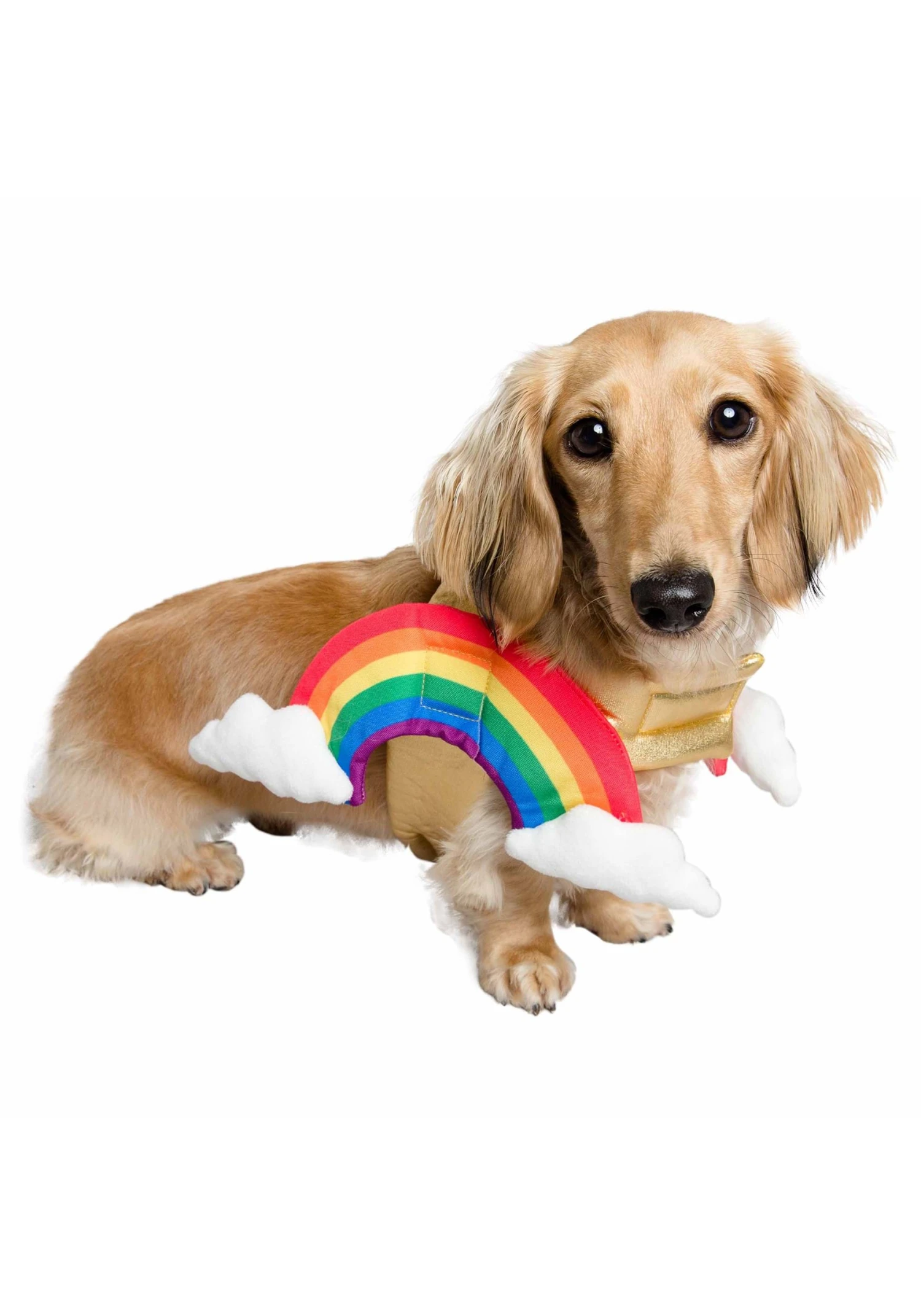 Deck the furry ray of sunshine in your life in a Rainbow Costume for Pets! The sweet outfit comes in different sizes to fit small, medium, and large animals. It features a multi-hued fabric rainbow shaped like an upside-down U, edged on both ends with puffy white fabric clouds. It’s attached to two sets of gold fabric straps with Velcro sewn to their ends. One fastens around your pet’s midsection, while the other adds security and stability by fastening around the chest.Â