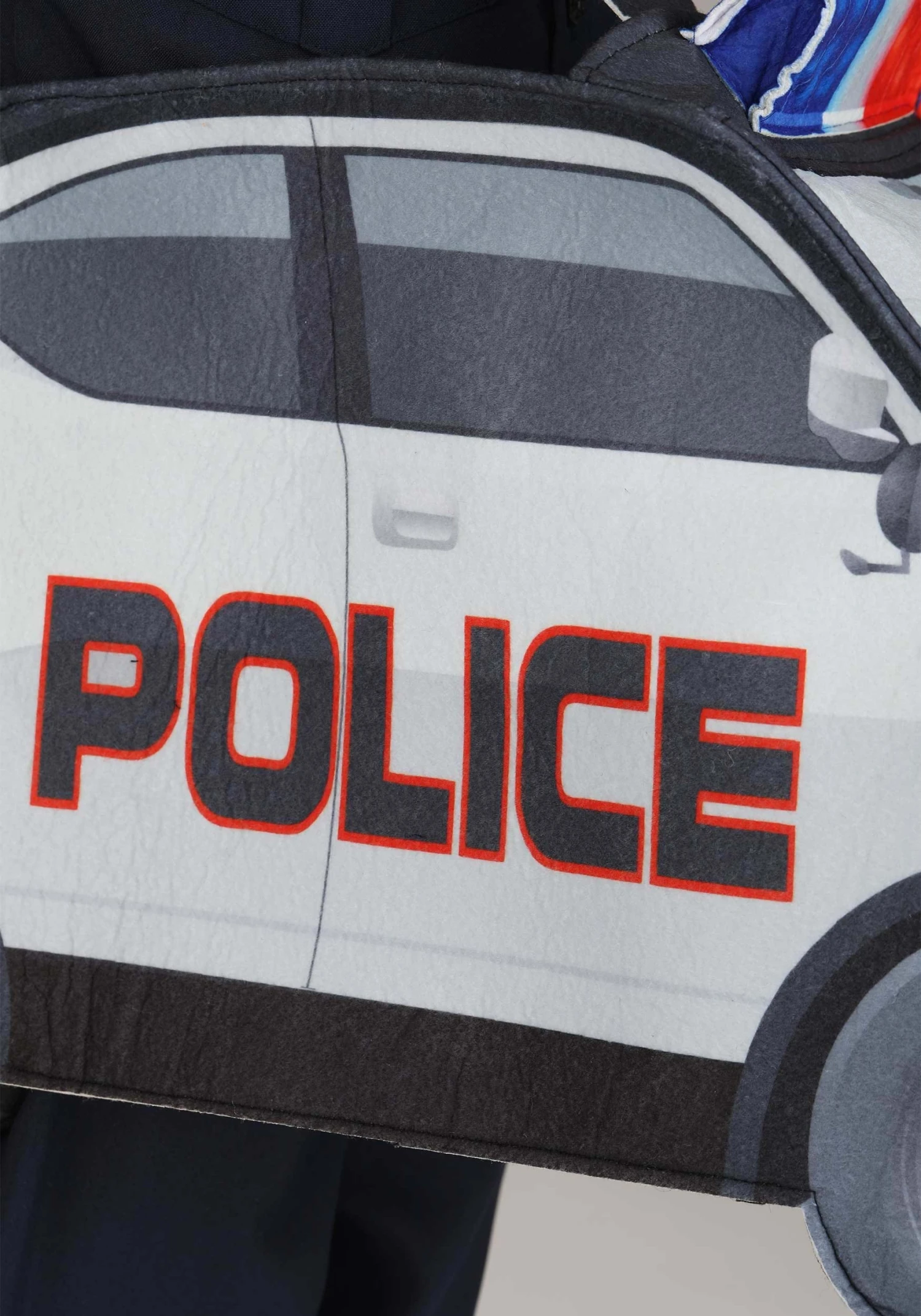 Lay down the law in this exclusive Ride In Police Car Costume for Kids! Perfect for pairing with a dark outfit or a full police uniform costume, the unisex tunic is made of stiffened felt and is shaped like a police car. It’s printed all over with graphics of a squad vehicle, from the light bar above the “windshield” to the word “Police” printed across the sides. The non-adjustable shoulder straps keep the tunic in place. The canvas and faux leather police hat is decorated with a plastic police badge.Â