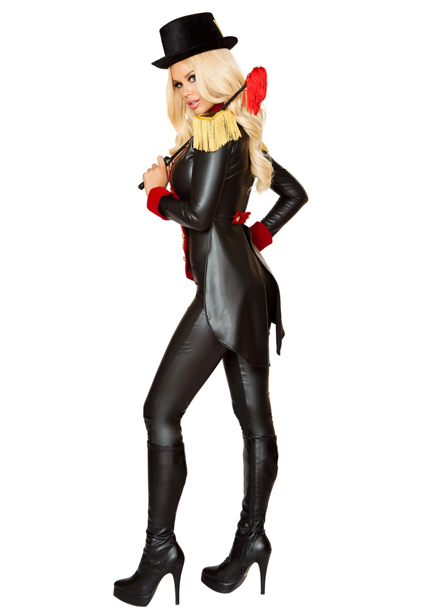 This catsuit is ready for showtime with sassy coattails attached to the back. The sleeves are detailed with gold tassels over the shoulders and red cuffs at the wrists. The front panel is accented with a red fabric border and gold values on each side with chains connecting them. Polish your look with the included top hat, find the whip of your choice, and your look will be complete.Â