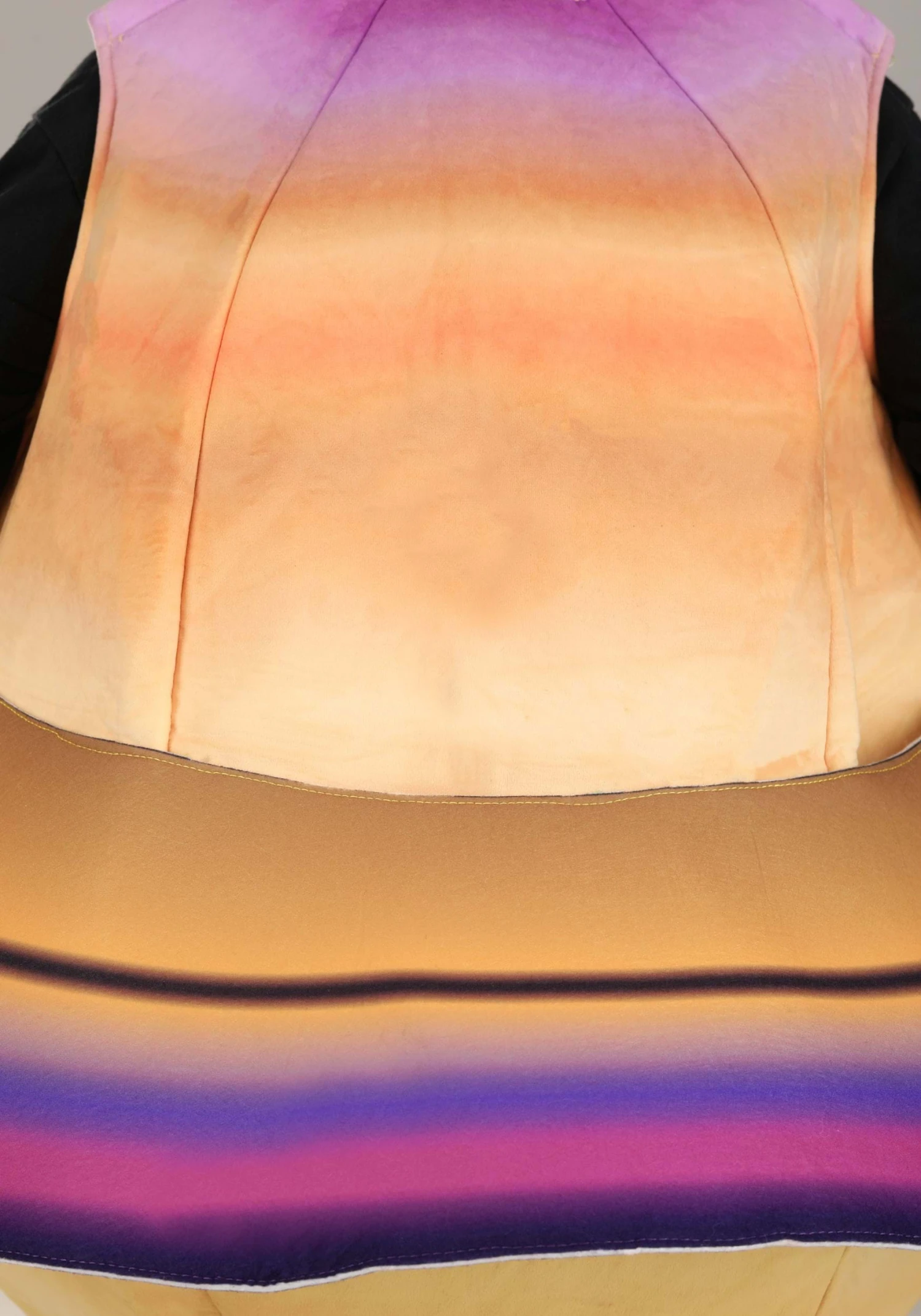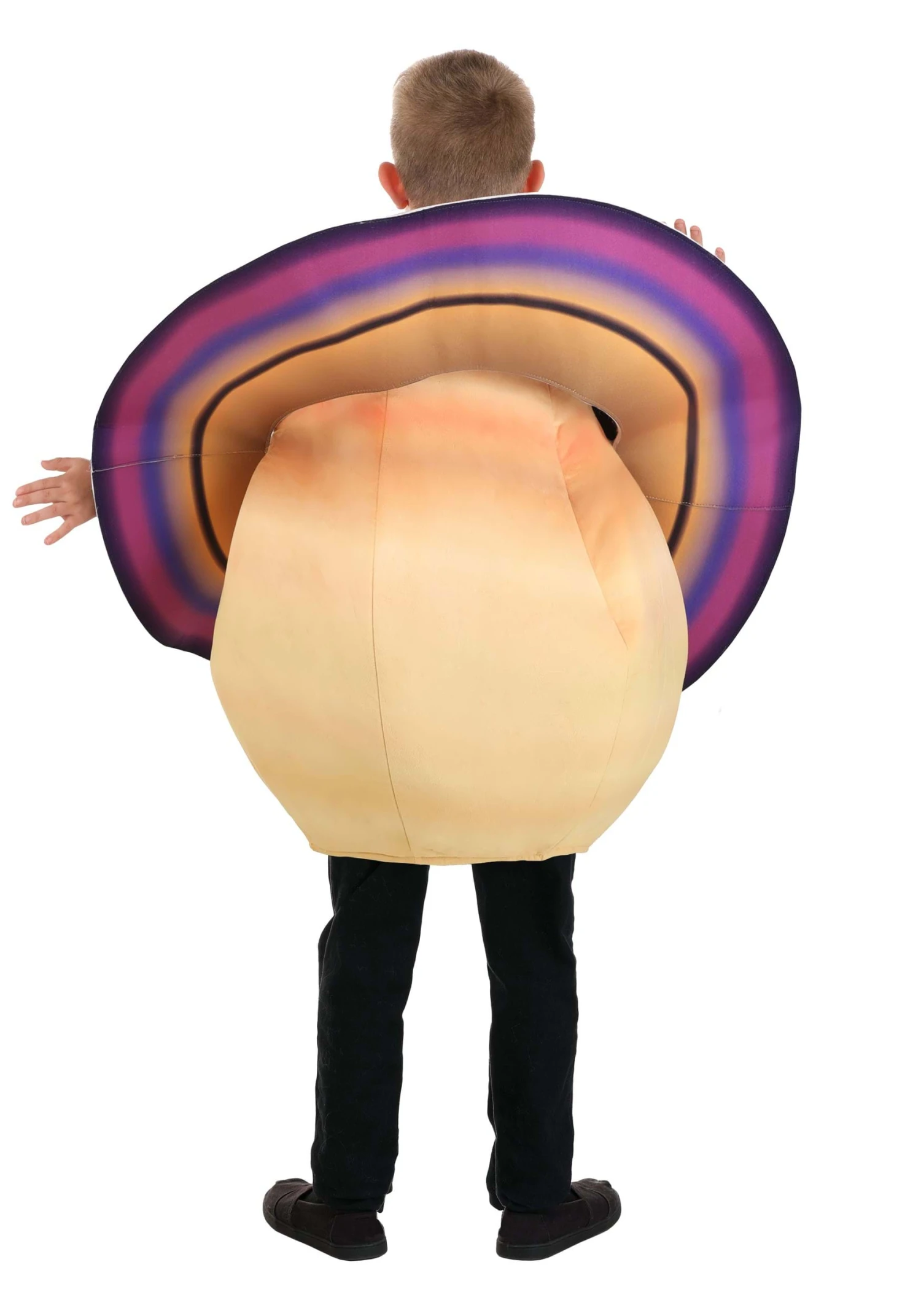 A spherical tunic printed to reflect Saturn’s familiar coloring keeps its shape with lightweight foam backing. Dressing is simple, with a large opening at the bottom of the tunic and hook-and-loop fastened shoulder seams that hold the tunic securely. Saturn’s rings are constructed with stiffened felt with multiple printed rings.