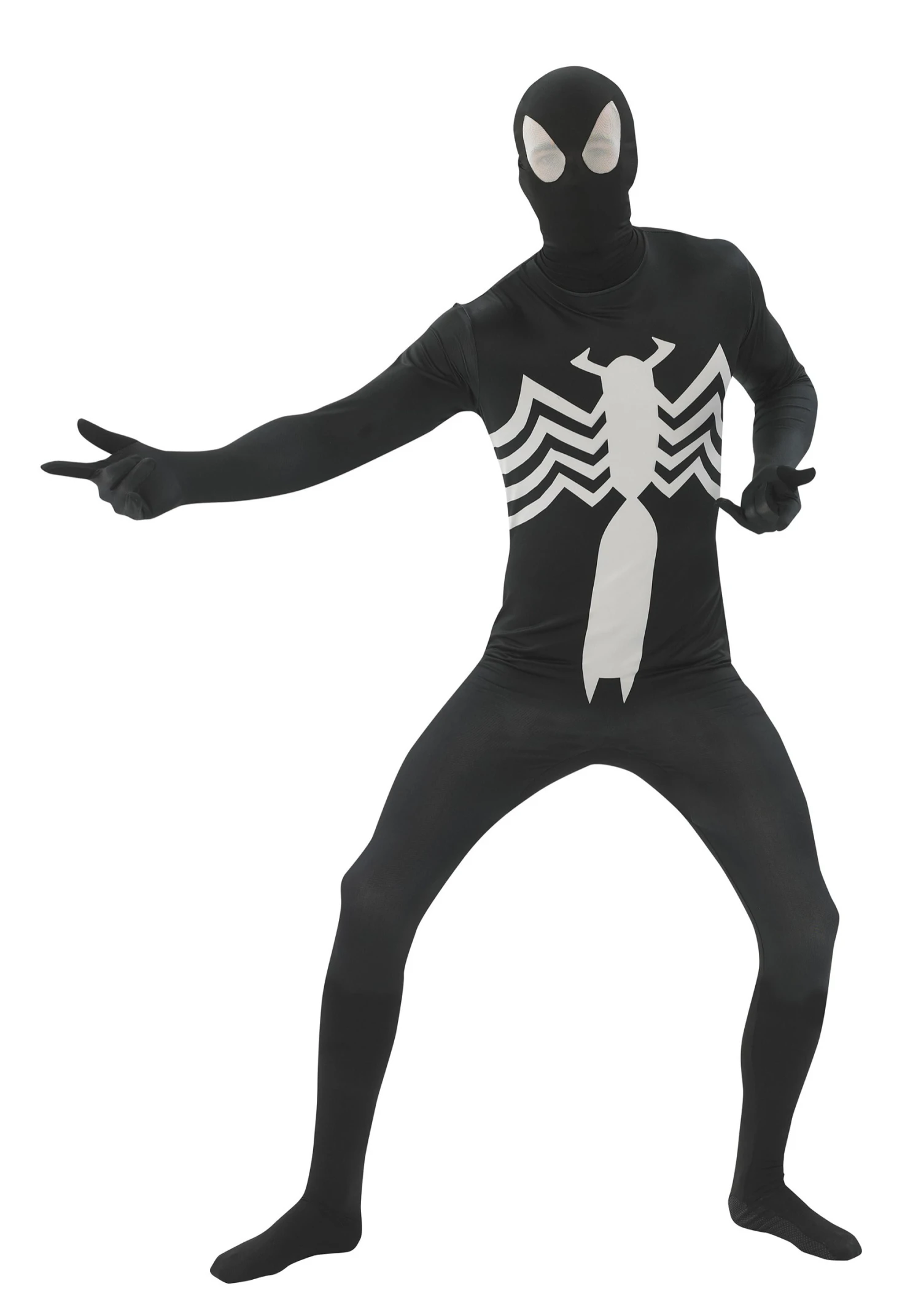This Spider-Man black adult costume recreates the classic costume that Peter Parker acquired during the Secret Wars comic books. This one is NOT alien lifeform, but is instead a spandex blend jumpsuit that fits like a glove! The front of the costume has the white spider symbol on the front. The mask portion of the suit has white mesh eyes for vision, but it does reduce some visibility while wearing it. Finally, make sure you hand wash this bad mamma jamma in cold water. It doesn’t like to be placed in the washing machine and it will hold up much better if you use those hands of yours to wash it!