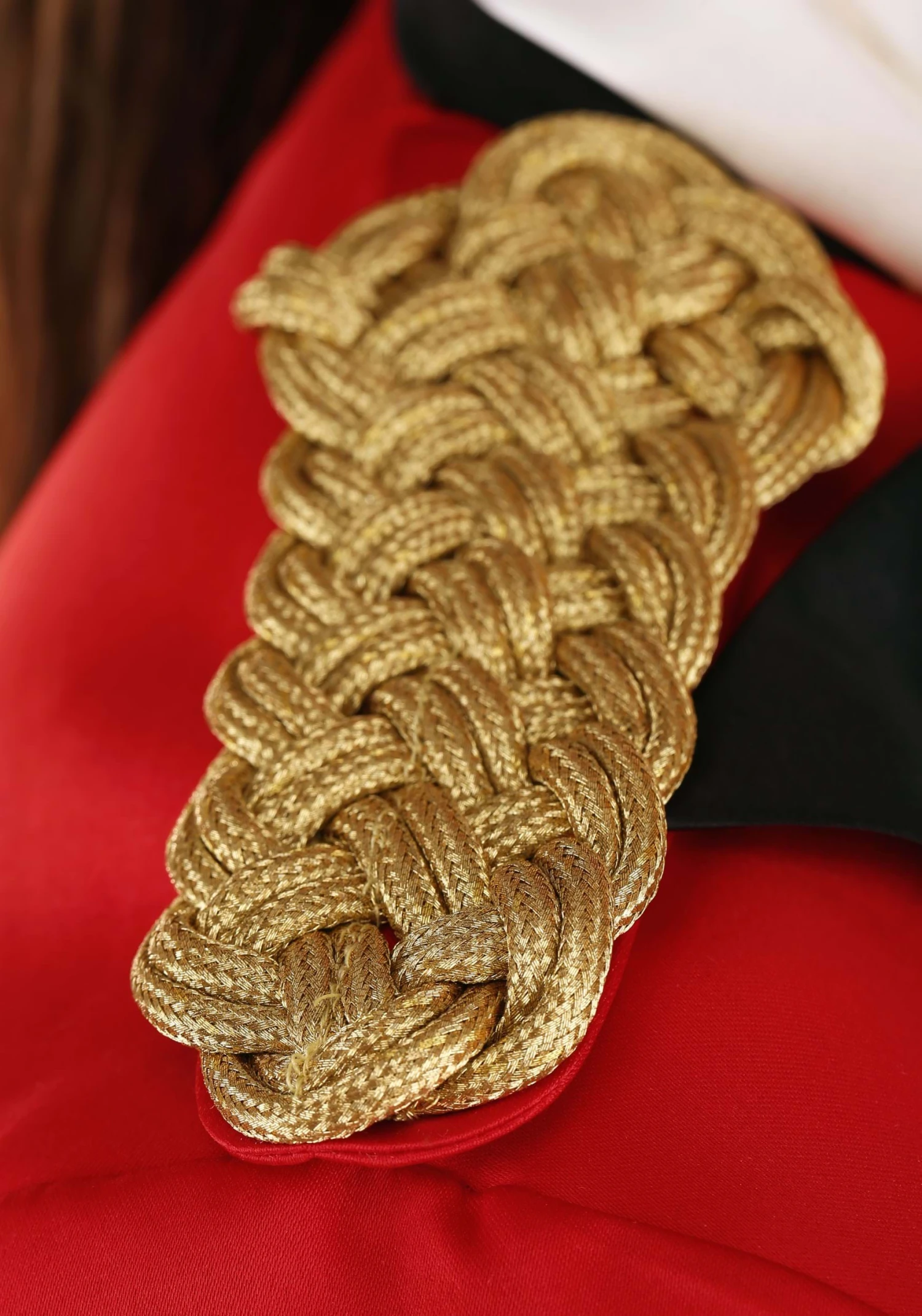 - Red tail coat has black cuffs and lapels w/ gold faux values