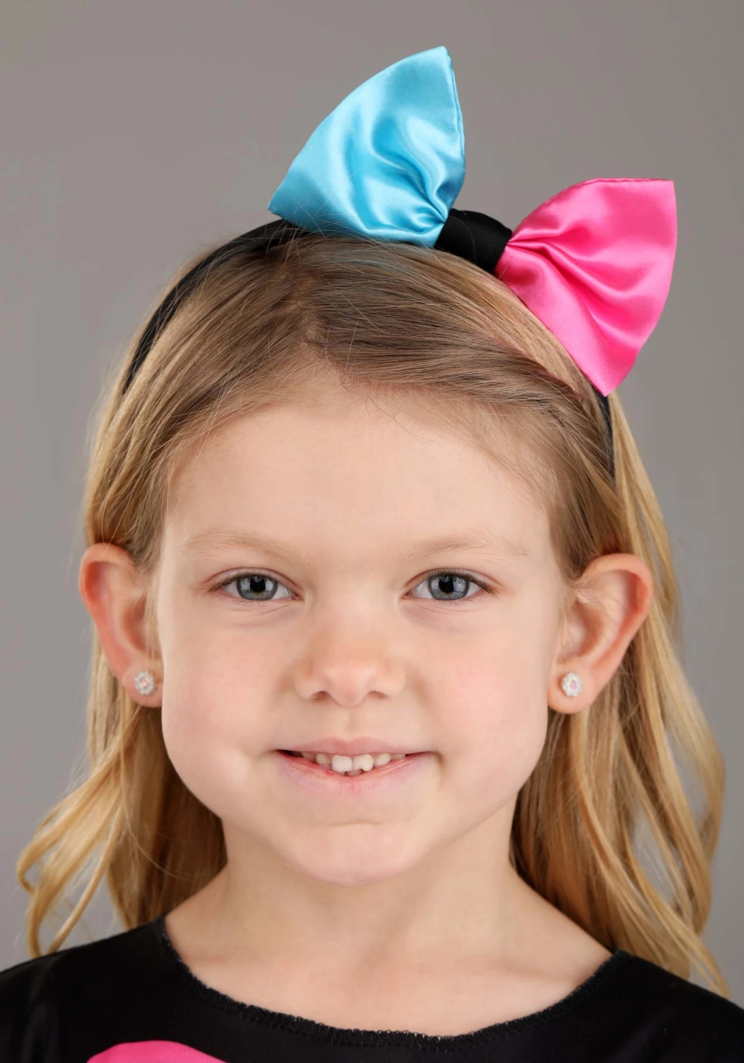 - Fabric-covered plastic headband has two-tone satin bow on top