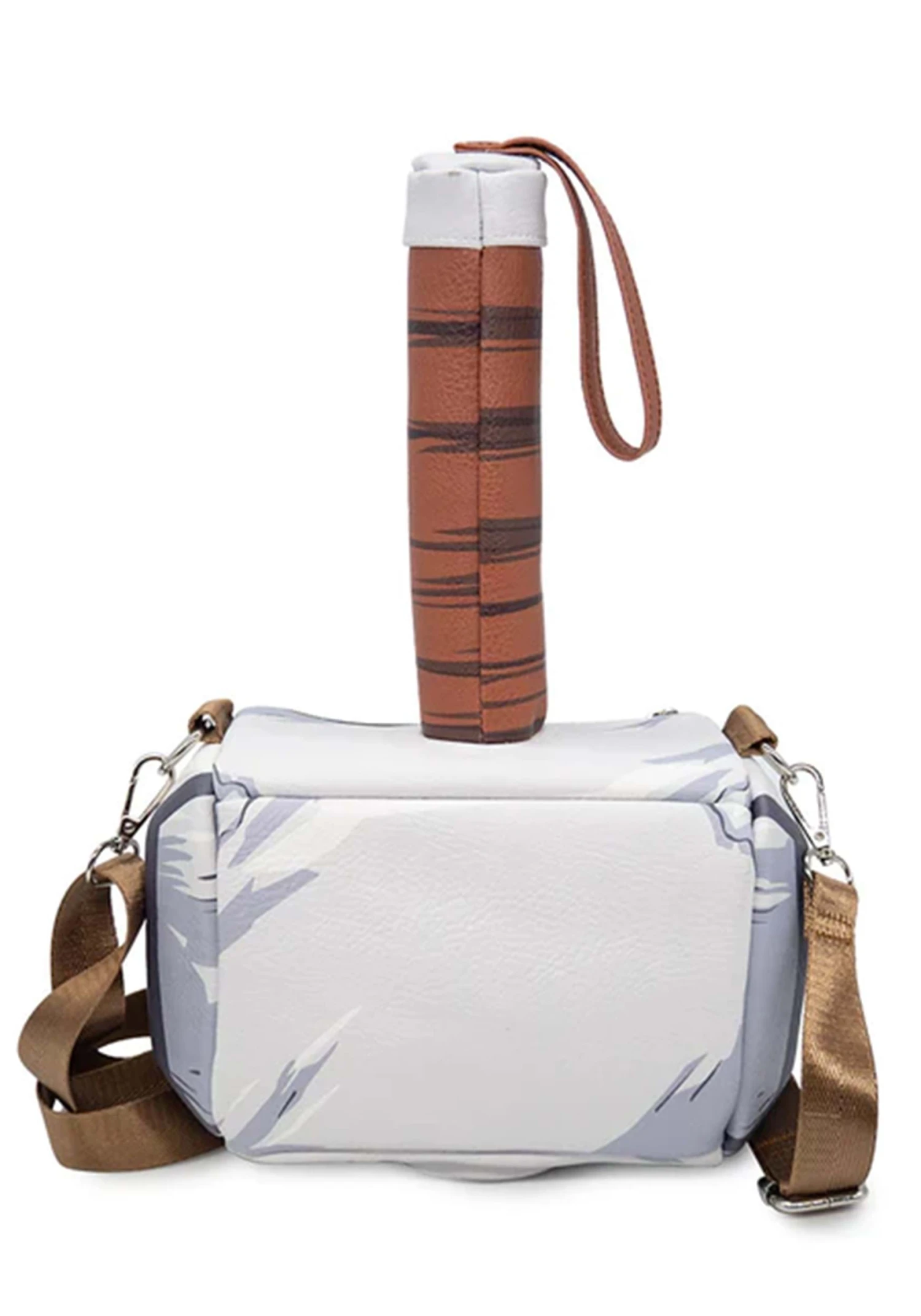The might of Mjolnir is in your hands (or over your shoulder, anyway) when you carry this officially licensed Thor Replica Hammer Crossbody Purse! The rectangular gray purse is printed with stone graphics and sewn with a long, stuffed “handle.” A zippered inner pocket holds money, keys, a phone, and other necessities. The included strap is length-adjustable.Â