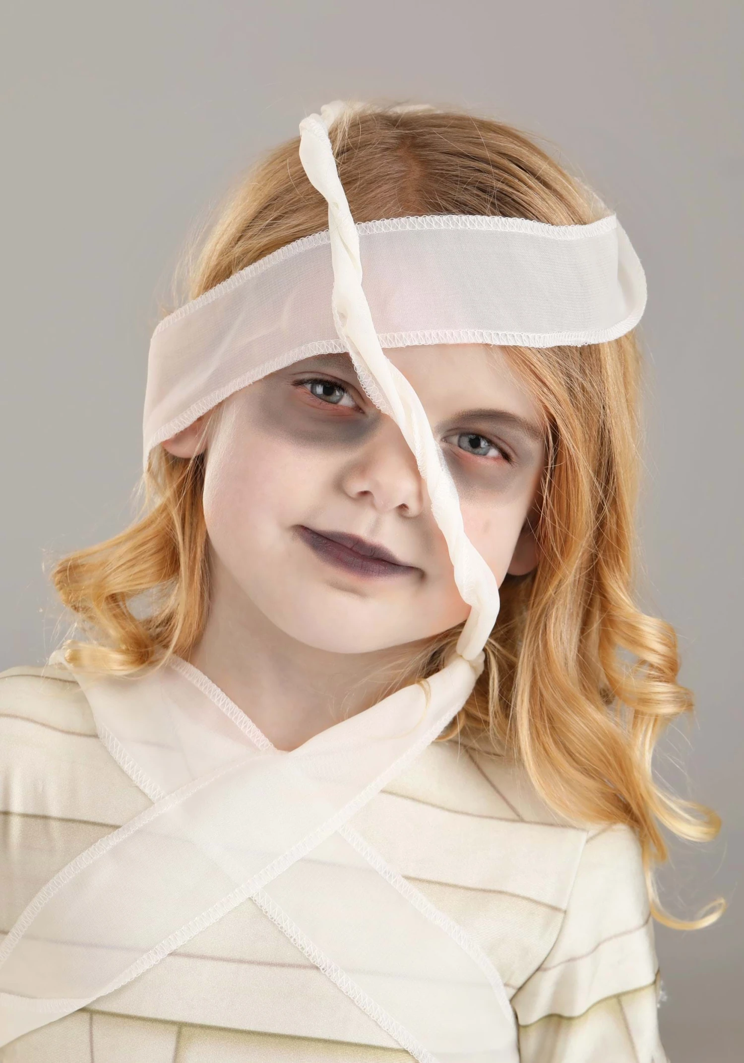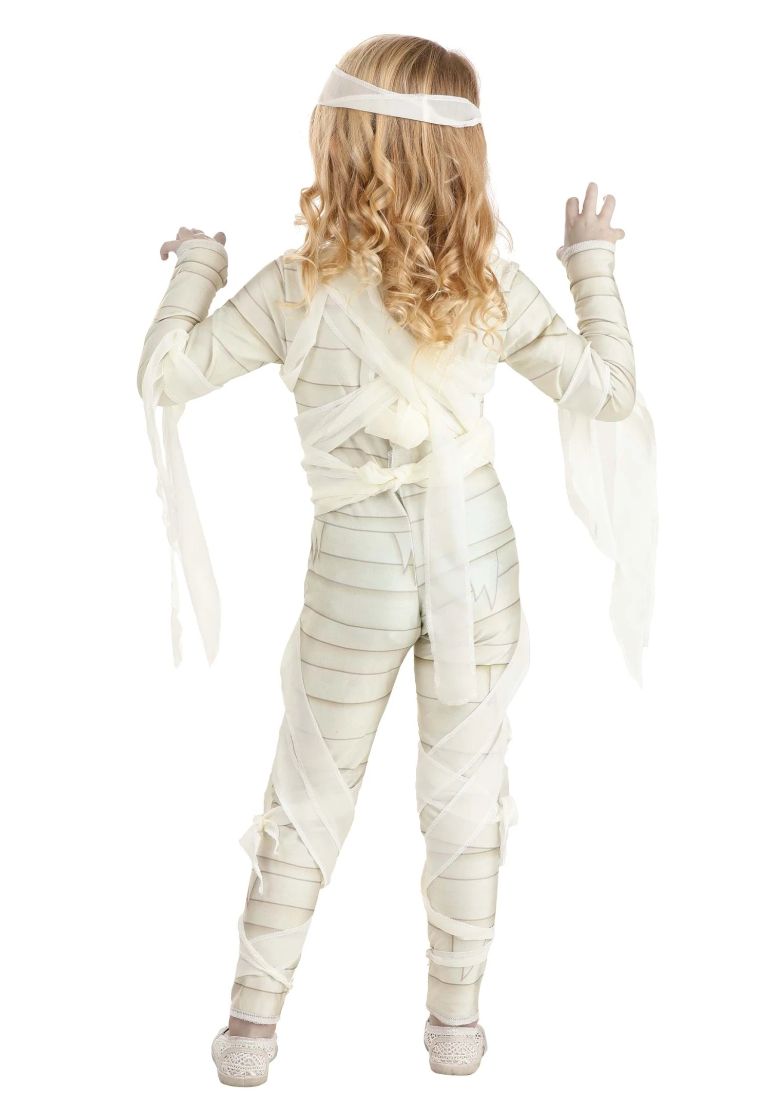 Your small ghoul will love frightening his or her friends in this exclusive Under Wraps Mummy Costume for Toddlers! The bodysuit fastens up the back and is made of soft off-white polyester fabric. It’s printed all over with graphics of wrapped and tattered bandages. Strips of semi-sheer white gauze are artfully criss-crossed around the chest, waist and legs, and hang in tatters from the long sleeves. The extra gauze strip headband can be wrapped around the forehead and tied as desired.