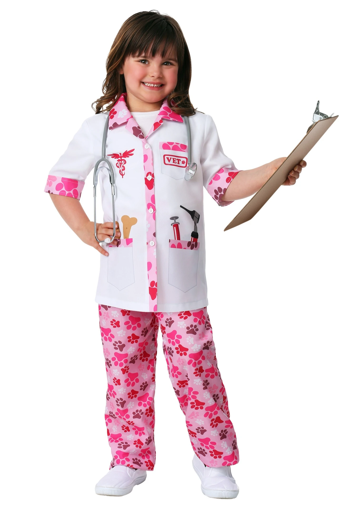 The Made by Us veterinarian costume was designed by our talented design team to imitate a uniform that a Vet. Made with an elastic waistband, the cheery pink pants are covered in pawprints and feel comfortable around the waist. The coat features real values but the pockets and medical tools are printed on the front. Also, this is an exclusive costume mixing ‘professional’ and ‘pretty’ to create a fun ensemble little girls will love!