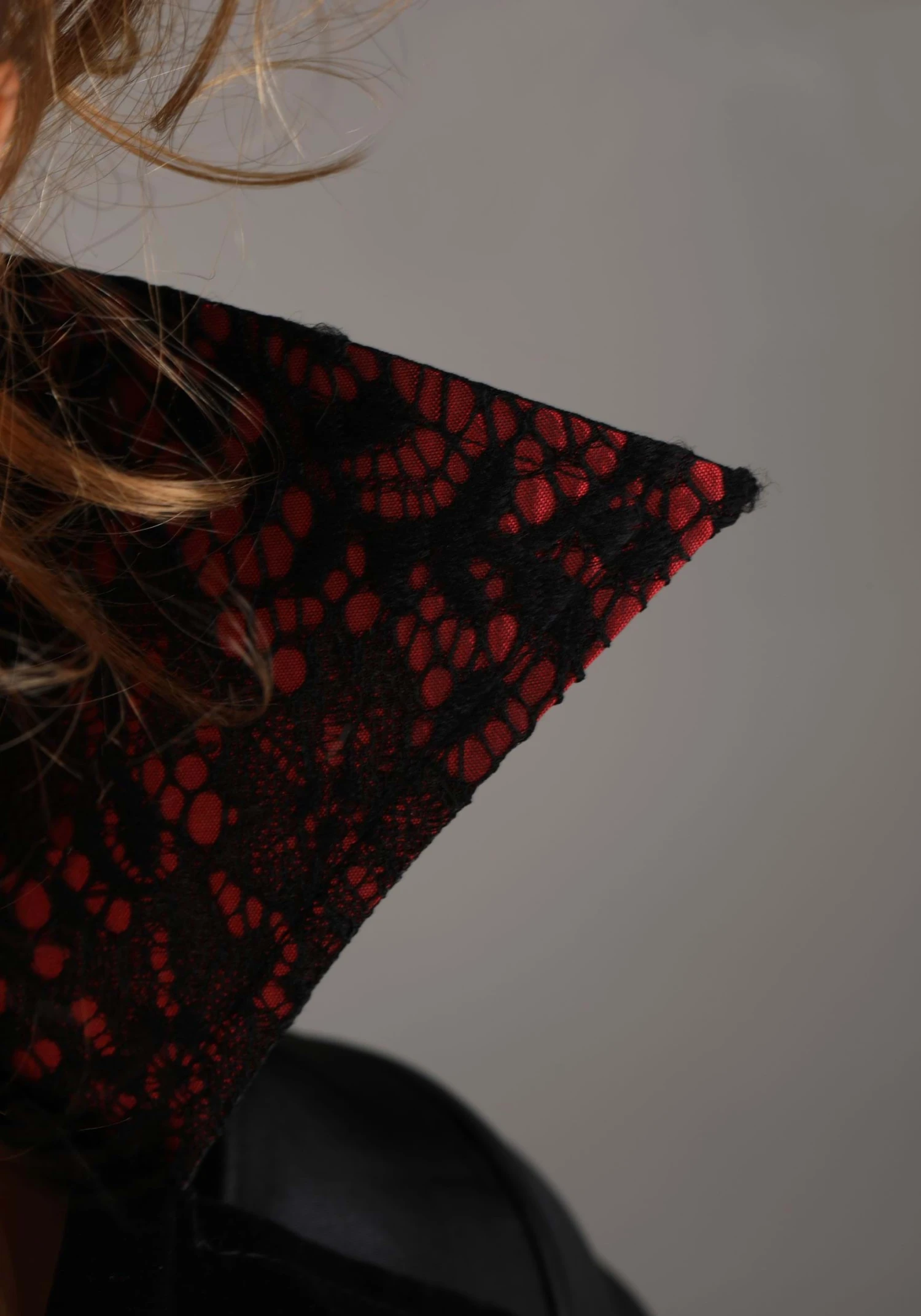 This Made By Us kid’s vampire costume starts with a mix of 100% polyester taffeta, velvet, and lace fabrics that ensure the design is as stylish as it is durable. While the costume looks like several layers, it is comprised of just one piece.